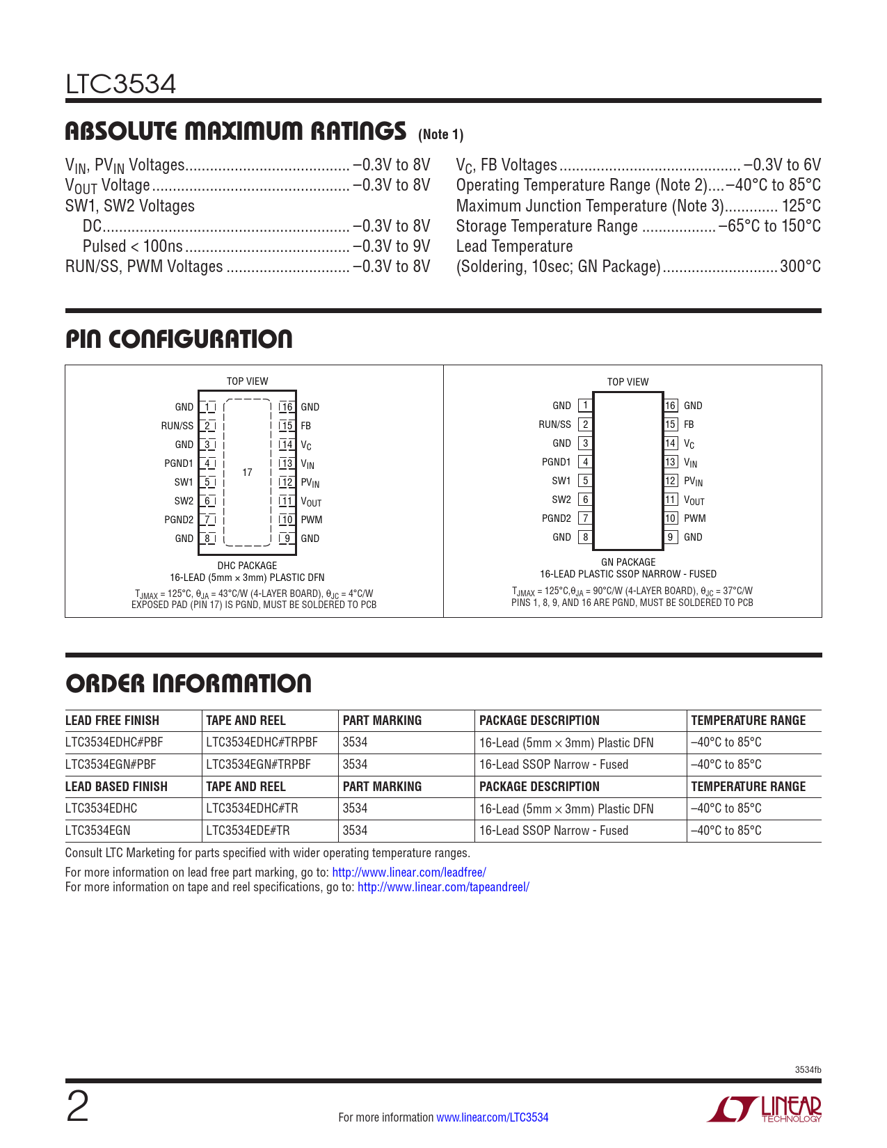 LTC3534EDHC#PBF LTC3534EDHC#TRPBF 3534 16-Lead (5mm × 3mm) Plastic DFN –40°C to 85°C LTC3534EGN#PBF LTC3534EGN#TRPBF 3534 16-Lead SSOP Narrow - Fused –40°C to 85°C