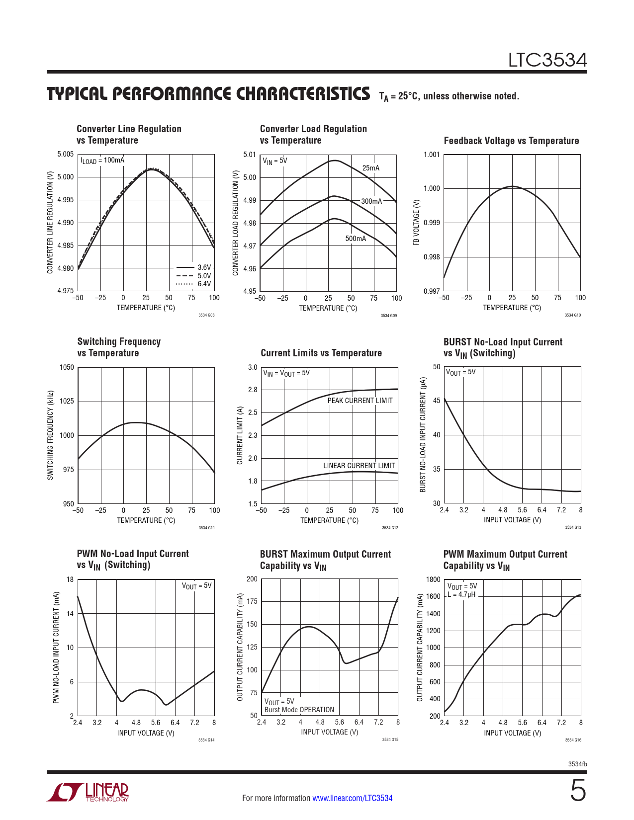 1050 3.0 50 VIN = VOUT = 5V VOUT = 5V 2.8 1025 PEAK CURRENT LIMIT 45 2.5 1000 2.3 40 CURRENT LIMIT (A) 2.0 975 LINEAR CURRENT LIMIT 35 SWITCHING FREQUENCY (kHz) 1.8 BURST NO-LOAD INPUT CURRENT (µA) 950 1.5 30 –50 –25 0 25 50 75 100 –50 –25 0 25 50 75 100 2.4 3.2 4 4.8 5.6 6.4 7.2 8 TEMPERATURE (°C) TEMPERATURE (°C) INPUT VOLTAGE (V) 3534 G11 3534 G12 3534 G13