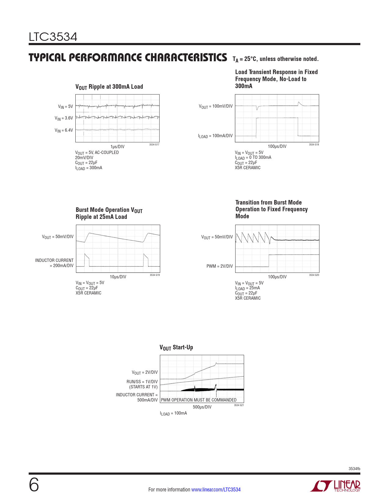 VIN = 5V VOUT = 100mV/DIV VIN = 3.6V VIN = 6.4V ILOAD = 100mA/DIV 1µs/DIV 3534 G17 100µs/DIV 3534 G18 VOUT = 5V, AC-COUPLED VIN = VOUT = 5V 20mV/DIV ILOAD = 0 TO 300mA COUT = 22µF COUT = 22µF ILOAD = 300mA X5R CERAMIC