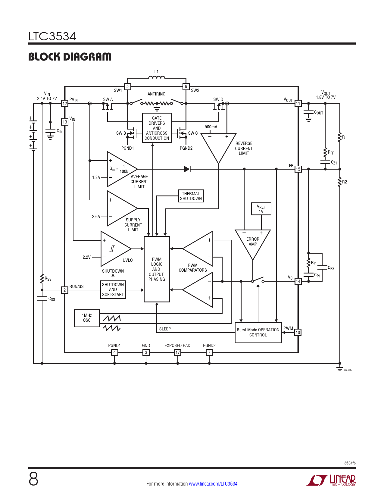 L1 5 6 SW1 SW2 VIN ANTIRING VOUT 2.4V TO 7V PV 1.8V TO 7V IN SW A SW D VOUT 12 11 COUT + VIN GATE 13 DRIVERS + AND –500mA CIN SW B ANTICROSS SW C – + + CONDUCTION R1 REVERSE + PGND1 PGND2 CURRENT LIMIT RFF + CZ1 1 FB Gm = 15 100k 1.8A AVERAGE – CURRENT R2 LIMIT THERMAL + SHUTDOWN VREF 1V 2.6A – SUPPLY CURRENT LIMIT – + + + ERROR AMP 2.2V – – UVLO PWM LOGIC RZ PWM AND CP2 SHUTDOWN COMPARATORS OUTPUT C R – V P1 SS PHASING C 14 RUN/SS SHUTDOWN 2 AND SOFT-START + CSS 1MHz OSC SLEEP Burst Mode OPERATION PWM CONTROL 10 PGND1 GND EXPOSED PAD PGND2 4 3 17 7 3534 BD 3534fb 8 For more information www.linear.com/LTC3534 Document Outline Features Applications Description Typical Application Absolute Maximum Ratings Pin Configuration Order Information Electrical Characteristics Typical Performance Characteristics Pin Functions Block Diagram Operation Applications Information Typical Applications Package Description Revision History Related Parts