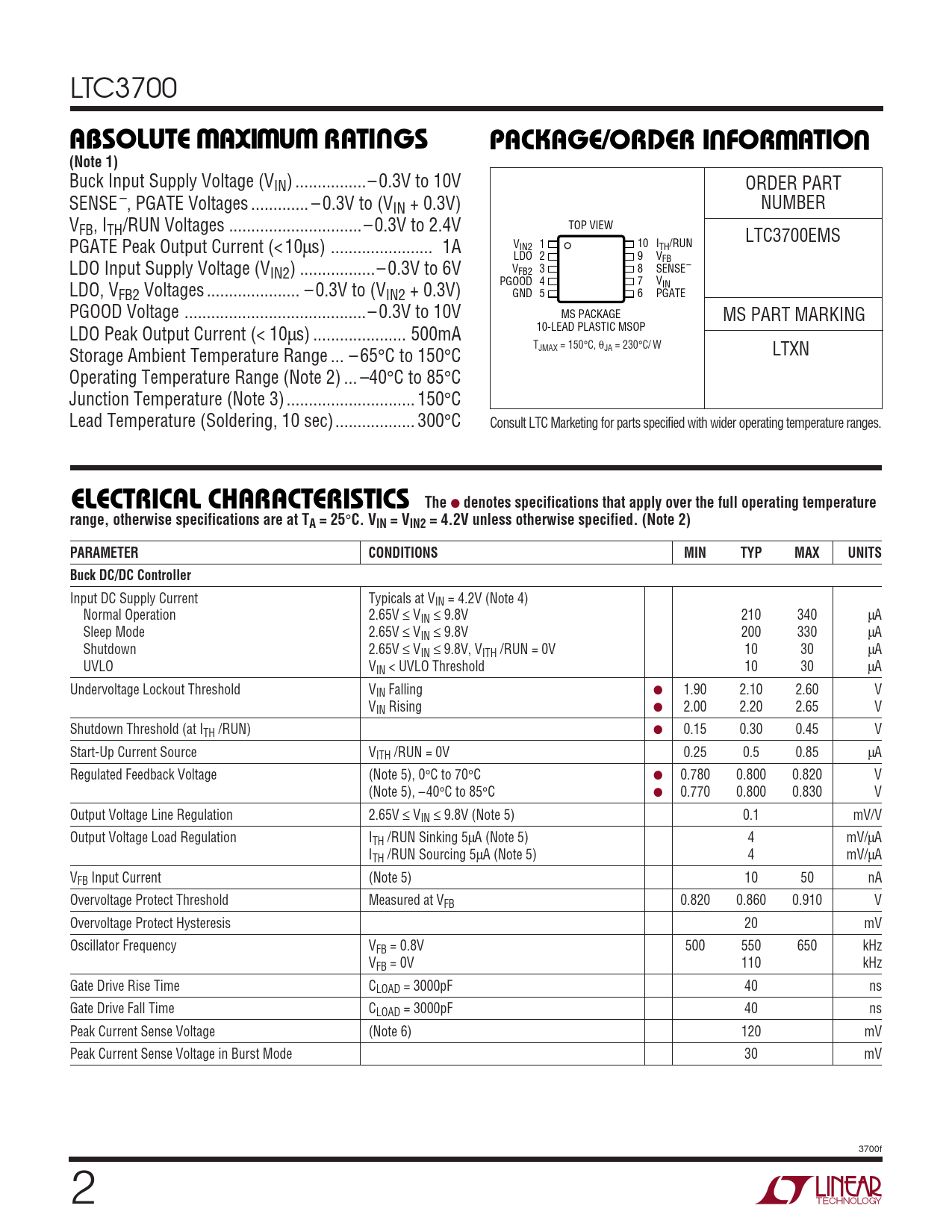 Input DC Supply Current Typicals at VIN = 4.2V (Note 4) Normal Operation 2.65V ≤ VIN ≤ 9.8V 210 340 µA Sleep Mode 2.65V ≤ VIN ≤ 9.8V 200 330 µA Shutdown 2.65V ≤ VIN ≤ 9.8V, VITH /RUN = 0V 10 30 µA UVLO VIN < UVLO Threshold 10 30 µA Undervoltage Lockout Threshold VIN Falling ● 1.90 2.10 2.60 V VIN Rising ● 2.00 2.20 2.65 V Shutdown Threshold (at ITH /RUN) ● 0.15 0.30 0.45 V Start-Up Current Source VITH /RUN = 0V 0.25 0.5 0.85 µA Regulated Feedback Voltage (Note 5), 0°C to 70°C ● 0.780 0.800 0.820 V (Note 5), –40°C to 85°C ● 0.770 0.800 0.830 V Output Voltage Line Regulation 2.65V ≤ VIN ≤ 9.8V (Note 5) 0.1 mV/V Output Voltage Load Regulation ITH /RUN Sinking 5µA (Note 5) 4 mV/µA ITH /RUN Sourcing 5µA (Note 5) 4 mV/µA VFB Input Current (Note 5) 10 50 nA Overvoltage Protect Threshold Measured at VFB 0.820 0.860 0.910 V Overvoltage Protect Hysteresis 20 mV Oscillator Frequency VFB = 0.8V 500 550 650 kHz VFB = 0V 110 kHz Gate Drive Rise Time CLOAD = 3000pF 40 ns Gate Drive Fall Time CLOAD = 3000pF 40 ns Peak Current Sense Voltage (Note 6) 120 mV Peak Current Sense Voltage in Burst Mode 30 mV 3700f 2