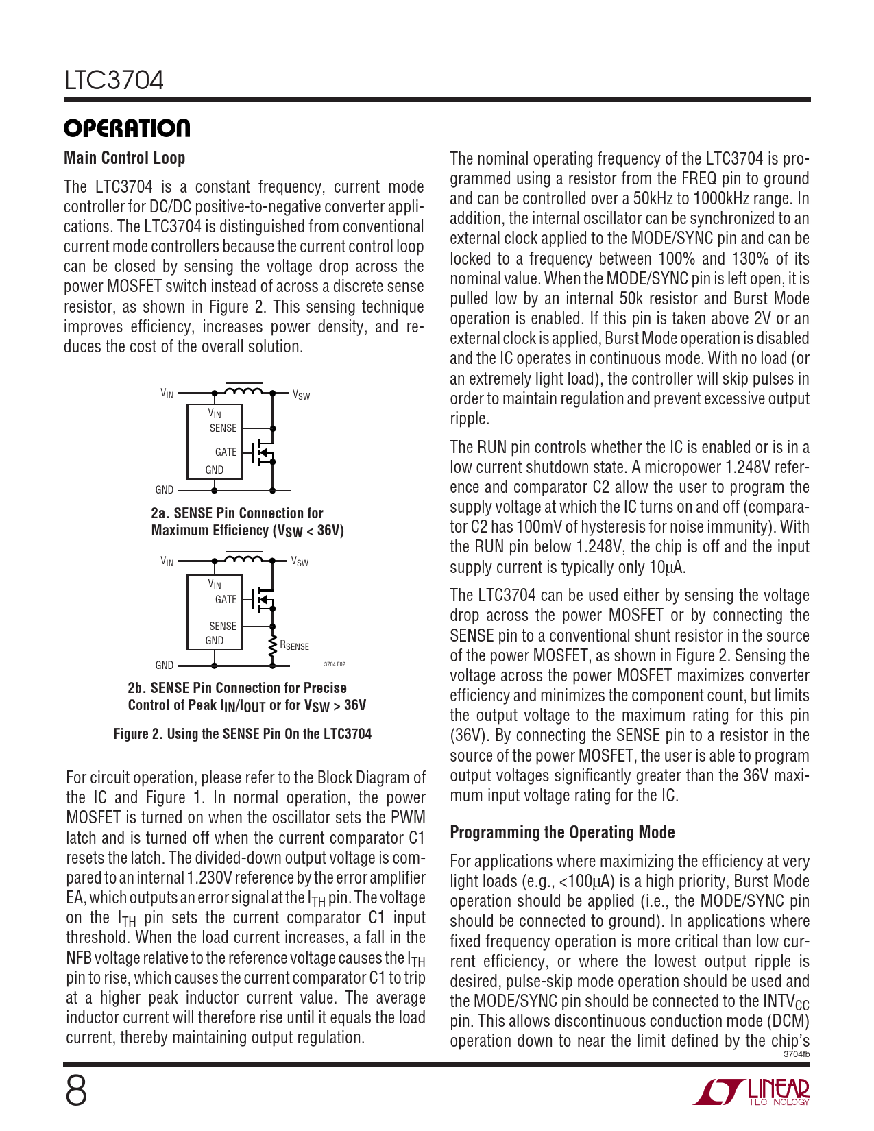 The nominal operating frequency of the LTC3704 is pro- The LTC3704 is a constant frequency, current mode grammed using a resistor from the FREQ pin to ground controller for DC/DC positive-to-negative converter appli- and can be controlled over a 50kHz to 1000kHz range. In cations. The LTC3704 is distinguished from conventional addition, the internal oscillator can be synchronized to an current mode controllers because the current control loop external clock applied to the MODE/SYNC pin and can be can be closed by sensing the voltage drop across the locked to a frequency between 100% and 130% of its power MOSFET switch instead of across a discrete sense nominal value. When the MODE/SYNC pin is left open, it is resistor, as shown in Figure 2. This sensing technique pulled low by an internal 50k resistor and Burst Mode improves efficiency, increases power density, and re- operation is enabled. If this pin is taken above 2V or an duces the cost of the overall solution. external clock is applied, Burst Mode operation is disabled and the IC operates in continuous mode. With no load (or an extremely light load), the controller will skip pulses in VIN VSW order to maintain regulation and prevent excessive output VIN ripple. SENSE The RUN pin controls whether the IC is enabled or is in a GATE GND low current shutdown state. A micropower 1.248V refer- GND ence and comparator C2 allow the user to program the supply voltage at which the IC turns on and off (compara-