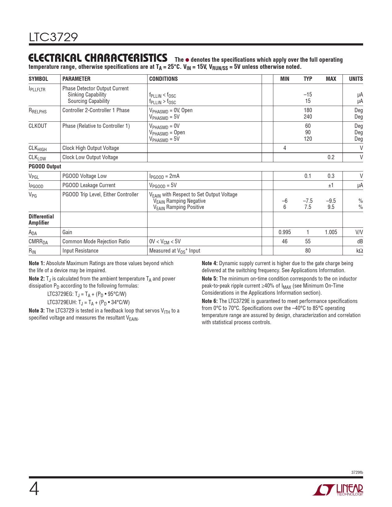 LTC3729 ELECTRICAL CHARACTERISTICSThe l denotes the specifications which apply over the full operatingtemperature range, otherwise specifications are at TA = 25°C. VIN = 15V, VRUN/SS = 5V unless otherwise noted. SYMBOLPARAMETERCONDITIONSMINTYPMAXUNITS IPLLFLTR Phase Detector Output Current Sinking Capability fPLLIN < fOSC –15 µA Sourcing Capability fPLLIN > fOSC 15 µA RRELPHS Controller 2‑Controller 1 Phase VPHASMD = 0V, Open 180 Deg VPHASMD = 5V 240 Deg CLKOUT Phase (Relative to Controller 1) VPHASMD = 0V 60 Deg VPHASMD = Open 90 Deg VPHASMD = 5V 120 Deg CLKHIGH Clock High Output Voltage 4 V CLKLOW Clock Low Output Voltage 0.2 V PGOOD Output VPGL PGOOD Voltage Low IPGOOD = 2mA 0.1 0.3 V IPGOOD PGOOD Leakage Current VPGOOD = 5V ±1 µA VPG PGOOD Trip Level, Either Controller VEAIN with Respect to Set Output Voltage VEAIN Ramping Negative –6 –7.5 –9.5 % VEAIN Ramping Positive 6 7.5 9.5 % DifferentialAmplifier ADA Gain 0.995 1 1.005 V/V CMRRDA Common Mode Rejection Ratio 0V < VCM < 5V 46 55 dB R + IN Input Resistance Measured at VOS Input 80 kΩ Note 1: Absolute Maximum Ratings are those values beyond which Note 4: Dynamic supply current is higher due to the gate charge being the life of a device may be impaired. delivered at the switching frequency. See Applications Information. Note 2: TJ is calculated from the ambient temperature TA and power Note 5: The minimum on‑time condition corresponds to the on inductor dissipation PD according to the following formulas: peak‑to‑peak ripple current ≥40% of IMAX (see Minimum On‑Time LTC3729EG: T Considerations in the Applications Information section). J = TA + (PD • 95°C/W) LTC3729EUH: T Note 6: The LTC3729E is guaranteed to meet performance specifications J = TA + (PD • 34°C/W) Note 3: The LTC3729 is tested in a feedback loop that servos V from 0°C to 70°C. Specifications over the –40°C to 85°C operating ITH to a specified voltage and measures the resultant V temperature range are assured by design, characterization and correlation EAIN. with statistical process controls. 3729fb 4 Document Outline Features Description Applications Typical Application Absolute Maximum Ratings Pin Configuration Order Information Electrical Characteristics Typical Performance Characteristics Pin Functions functional Diagram Operation Applications Information Typical Applications Package Description Revision History Typical Application Related Parts