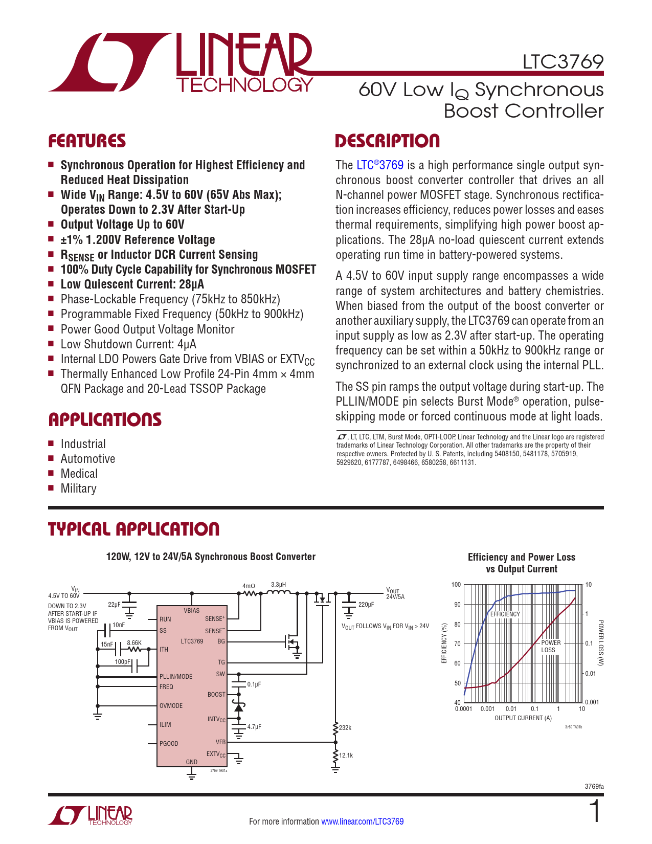 LTC3769 60V Low IQ Synchronous Boost Controller FEATURESDESCRIPTION n Synchronous Operation for Highest Efficiency and The LTC®3769 is a high performance single output syn- Reduced Heat Dissipation chronous boost converter controller that drives an all n Wide VIN Range: 4.5V to 60V (65V Abs Max); N-channel power MOSFET stage. Synchronous rectifica- Operates Down to 2.3V After Start-Up tion increases efficiency, reduces power losses and eases n Output Voltage Up to 60V thermal requirements, simplifying high power boost ap- n ±1% 1.200V Reference Voltage plications. The 28µA no-load quiescent current extends n RSENSE or Inductor DCR Current Sensing operating run time in battery-powered systems. n 100% Duty Cycle Capability for Synchronous MOSFET A 4.5V to 60V input supply range encompasses a wide n Low Quiescent Current: 28μA range of system architectures and battery chemistries. n Phase-Lockable Frequency (75kHz to 850kHz) When biased from the output of the boost converter or n Programmable Fixed Frequency (50kHz to 900kHz) another auxiliary supply, the LTC3769 can operate from an n Power Good Output Voltage Monitor input supply as low as 2.3V after start-up. The operating n Low Shutdown Current: 4µA frequency can be set within a 50kHz to 900kHz range or n Internal LDO Powers Gate Drive from VBIAS or EXTVCC synchronized to an external clock using the internal PLL. n Thermally Enhanced Low Profile 24-Pin 4mm × 4mm QFN Package and 20-Lead TSSOP Package The SS pin ramps the output voltage during start-up. The PLLIN/MODE pin selects Burst Mode® operation, pulse- skipping mode or forced continuous mode at light loads. APPLICATIONS L, LT, LTC, LTM, Burst Mode, OPTI-LOOP, Linear Technology and the Linear logo are registered n Industrial trademarks of Linear Technology Corporation. All other trademarks are the property of their respective owners. Protected by U. S. Patents, including 5408150, 5481178, 5705919, n Automotive 5929620, 6177787, 6498466, 6580258, 6611131. n Medical n Military TYPICAL APPLICATION120W, 12V to 24V/5A Synchronous Boost ConverterEfficiency and Power Lossvs Output Current 4mΩ 3.3µH 100 10 VIN VOUT 4.5V TO 60V 24V/5A 22µF 220µF DOWN TO 2.3V 90 VBIAS AFTER START-UP IF EFFICIENCY 1 VBIAS IS POWERED RUN SENSE+ POWER LOSS (W) 10nF V FROM V 80 OUT FOLLOWS VIN FOR VIN > 24V OUT SENSE– SS 15nF 8.66K LTC3769 BG 70 POWER 0.1 ITH LOSS 100pF TG EFFICIENCY (%) 60 SW PLLIN/MODE 0.01 0.1µF FREQ 50 BOOST OVMODE 40 0.001 0.0001 0.001 0.01 0.1 1 10 INTVCC OUTPUT CURRENT (A) ILIM 4.7µF 232k 3769 TA01b PGOOD VFB EXTVCC 12.1k GND 3769 TA01a 3769fa For more information www.linear.com/LTC3769 1 Document Outline Features Applications Description Typical Application Absolute Maximum Ratings Pin Configuration Order Information Electrical Characteristics Typical Performance Characteristics Pin Functions Block Diagram Operation Applications Information Typical Applications Revision History Typical Application Related Parts