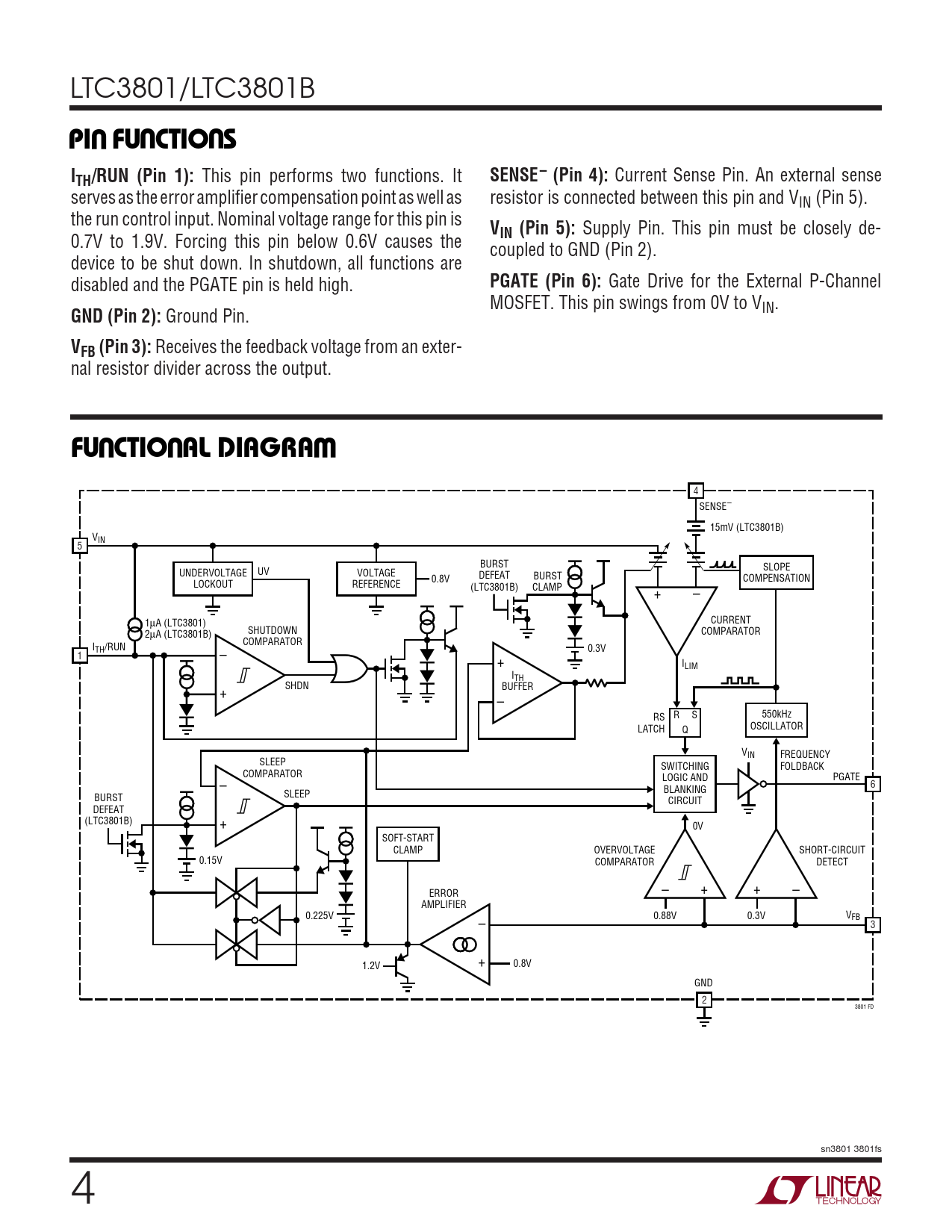 4 SENSE– 15mV (LTC3801B) VIN 5 BURST UNDERVOLTAGE UV SLOPE VOLTAGE DEFEAT BURST 0.8V COMPENSATION LOCKOUT REFERENCE (LTC3801B) CLAMP + – 1µA (LTC3801) CURRENT SHUTDOWN 2µA (LTC3801B) COMPARATOR ITH/RUN – COMPARATOR 0.3V 1 + ILIM ITH + SHDN BUFFER – R S 550kHz RS OSCILLATOR LATCH Q VIN FREQUENCY SLEEP SWITCHING FOLDBACK – COMPARATOR LOGIC AND PGATE 6 SLEEP BLANKING BURST CIRCUIT DEFEAT + (LTC3801B) 0V SOFT-START CLAMP OVERVOLTAGE SHORT-CIRCUIT 0.15V COMPARATOR DETECT ERROR – + + – AMPLIFIER 0.225V – 0.88V 0.3V VFB 3 + 1.2V 0.8V GND 2 3801 FD sn3801 3801fs 4