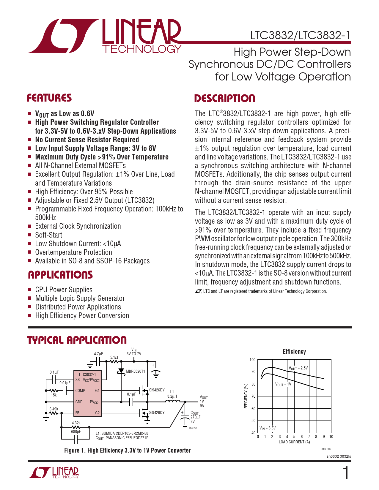 LTC3832/LTC3832-1 High Power Step-Down Synchronous DC/DC Controllers for Low Voltage Operation UFEATURESDESCRIPTIO ■ VOUT as Low as 0.6V The LTC®3832/LTC3832-1 are high power, high effi- ■ High Power Switching Regulator Controller ciency switching regulator controllers optimized for for 3.3V-5V to 0.6V-3.xV Step-Down Applications 3.3V-5V to 0.6V-3.xV step-down applications. A preci- ■ No Current Sense Resistor Required sion internal reference and feedback system provide ■ Low Input Supply Voltage Range: 3V to 8V ±1% output regulation over temperature, load current ■ Maximum Duty Cycle > 91% Over Temperature and line voltage variations. The LTC3832/LTC3832-1 use ■ All N-Channel External MOSFETs a synchronous switching architecture with N-channel ■ Excellent Output Regulation: ±1% Over Line, Load MOSFETs. Additionally, the chip senses output current and Temperature Variations through the drain-source resistance of the upper ■ High Efficiency: Over 95% Possible N-channel MOSFET, providing an adjustable current limit ■ Adjustable or Fixed 2.5V Output (LTC3832) without a current sense resistor. ■ Programmable Fixed Frequency Operation: 100kHz to The LTC3832/LTC3832-1 operate with an input supply 500kHz voltage as low as 3V and with a maximum duty cycle of ■ External Clock Synchronization >91% over temperature. They include a fixed frequency ■ Soft-Start PWM oscillator for low output ripple operation. The 300kHz ■ Low Shutdown Current: <10µA free-running clock frequency can be externally adjusted or ■ Overtemperature Protection synchronized with an external signal from 100kHz to 500kHz. ■ Available in SO-8 and SSOP-16 Packages In shutdown mode, the LTC3832 supply current drops to U <10µA. The LTC3832-1 is the SO-8 version without current APPLICATIO S limit, frequency adjustment and shutdown functions. ■ CPU Power Supplies , LTC and LT are registered trademarks of Linear Technology Corporation. ■ Multiple Logic Supply Generator ■ Distributed Power Applications ■ High Efficiency Power Conversion UTYPICAL APPLICATIO VIN Efficiency 4.7µF 3V TO 7V 5.1Ω 100 + VOUT = 2.5V 0.1µF MBR0520T1 90 LTC3832-1 SS VCC/PVCC2 0.01µF 80 VOUT = 1V COMP G1 Si9426DY L1 15k 0.1µF 3.2µH V 70 OUT GND PVCC1 1V 9A 6.49k EFFICIENCY (%) 60 FB G2 Si9426DY + COUT 270µF 2V 50 4.32k 3832 F01 VIN = 3.3V 680pF L1: SUMIDA CDEP105-3R2MC-88 40 C 0 1 2 3 4 5 6 7 8 9 10 OUT: PANASONIC EEFUEOD271R LOAD CURRENT (A) Figure 1. High Efficiency 3.3V to 1V Power Converter 3832 F01b sn3832 3832fs 1