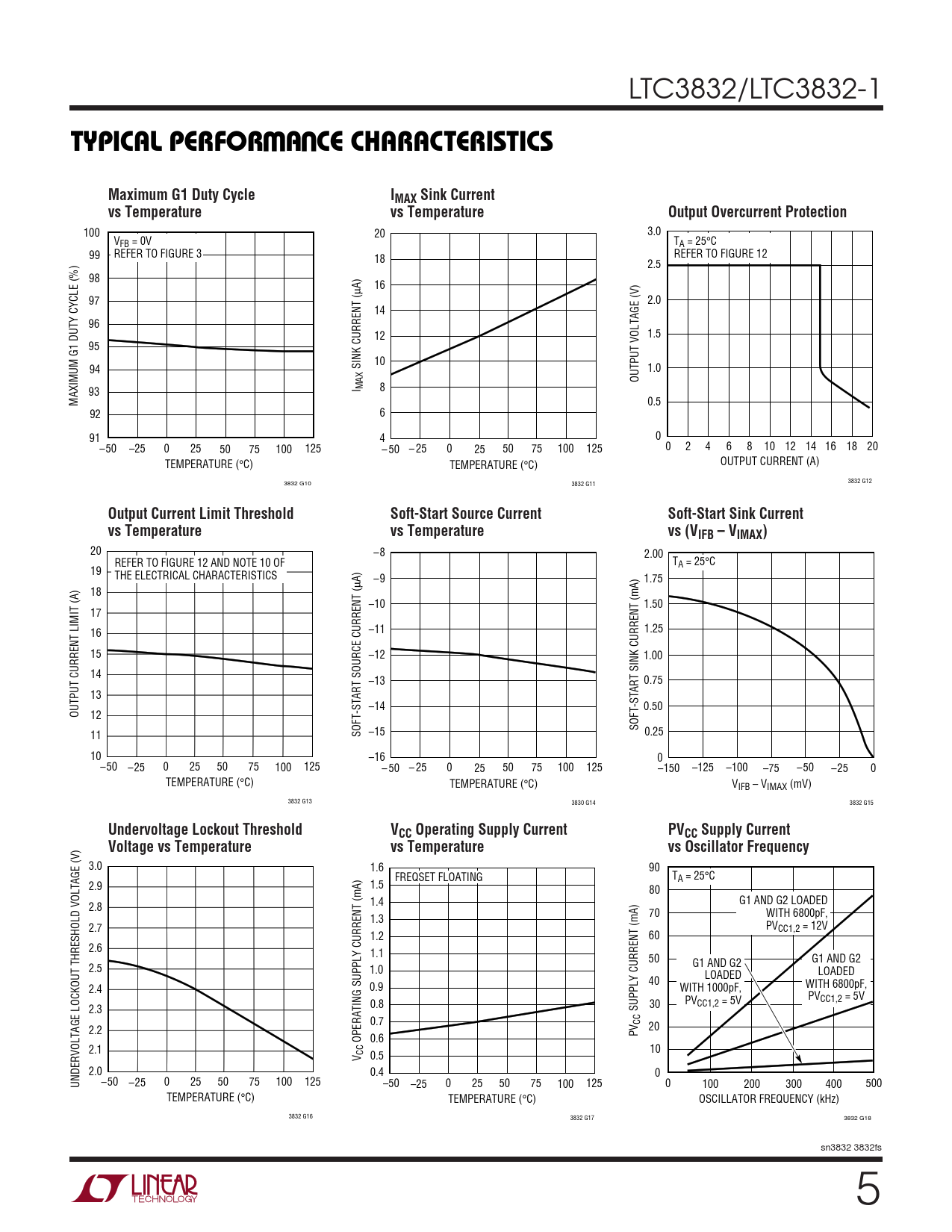 3.0 1.6 90 FREQSET FLOATING TA = 25°C 2.9 1.5 80 1.4 G1 AND G2 LOADED 2.8 70 WITH 6800pF, 1.3 2.7 PVCC1,2 = 12V 1.2 60 2.6 1.1 50 G1 AND G2 G1 AND G2 2.5 1.0 LOADED LOADED 40 WITH 6800pF, 2.4 0.9 WITH 1000pF, PVCC1,2 = 5V 0.8 30 PVCC1,2 = 5V 2.3 SUPPLY CURRENT (mA) 0.7 CC 2.2 20 PV OPERATING SUPPLY CURRENT (mA) 0.6 2.1 CC 10 V 0.5 2.0 0.4 0 –50 UNDERVOLTAGE LOCKOUT THRESHOLD VOLTAGE (V) –25 0 25 50 75 100 125 –50 –25 0 25 50 75 100 125 0 100 200 300 400 500 TEMPERATURE (°C) TEMPERATURE (°C) OSCILLATOR FREQUENCY (kHz) 3832 G16 3832 G17 3832 G18 sn3832 3832fs 5