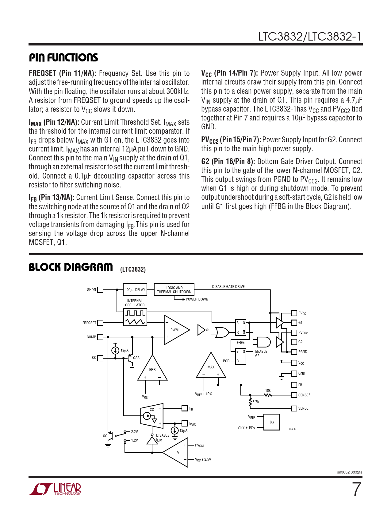 DISABLE GATE DRIVE LOGIC AND SHDN 100µs DELAY THERMAL SHUTDOWN INTERNAL POWER DOWN OSCILLATOR PVCC1 – FREQSET S Q G1 PWM R Q PVCC2 + COMP FFBG G2 12µA S Q ENABLE PGND G2 SS QSS POR R VCC MAX ERR – + GND + – FB 18k VREF + 10% SENSE+ VREF 5.7k CC – I SENSE– FB VREF BG + IMAX VREF + 10% 3832 BD 2.2V 12µA QC DISABLE 1.2V ILIM + PVCC1 V – VCC + 2.5V sn3832 3832fs 7
