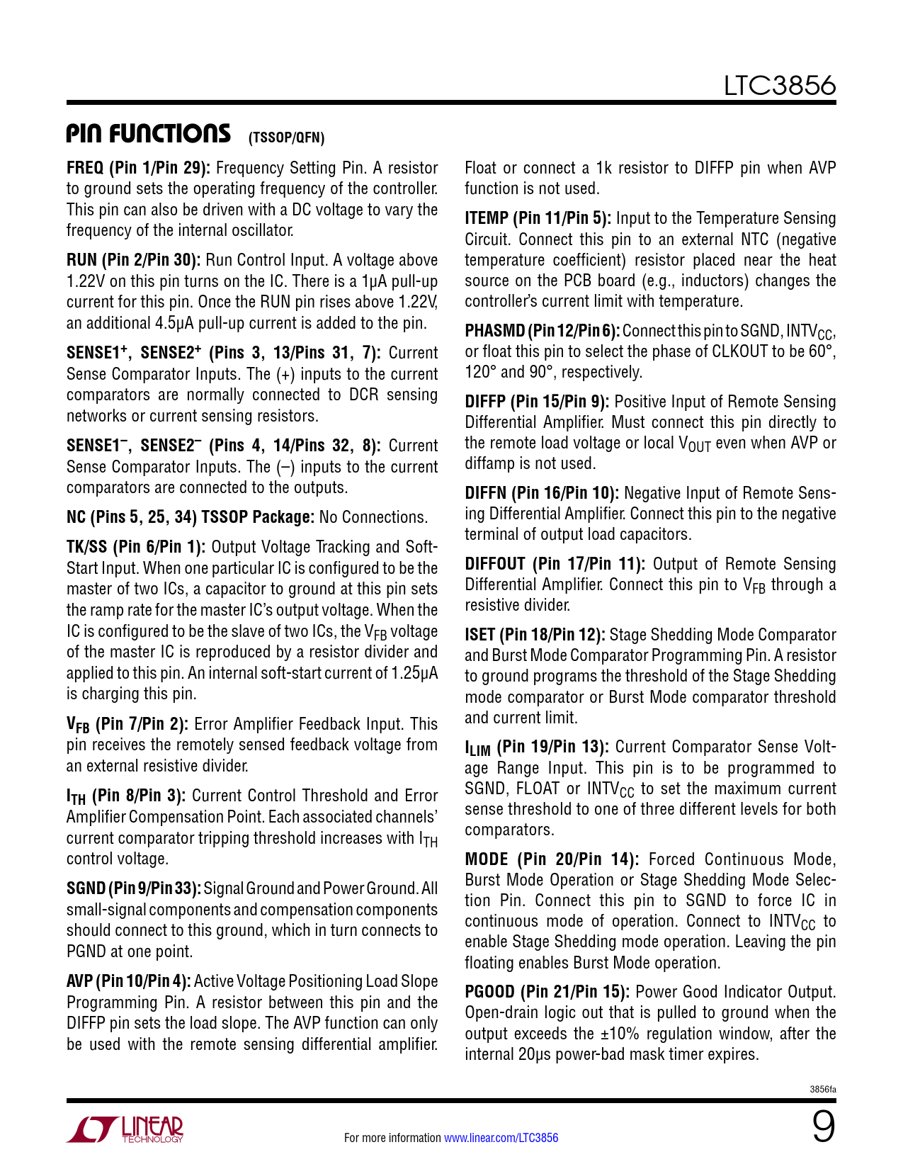 pin FuncTions (TSSOP/QFN). FREQ (Pin 1/Pin 29):. ITEMP (Pin 11/Pin 5):. RUN (Pin 2/Pin 30):. PHASMD (Pin 12/Pin 6):