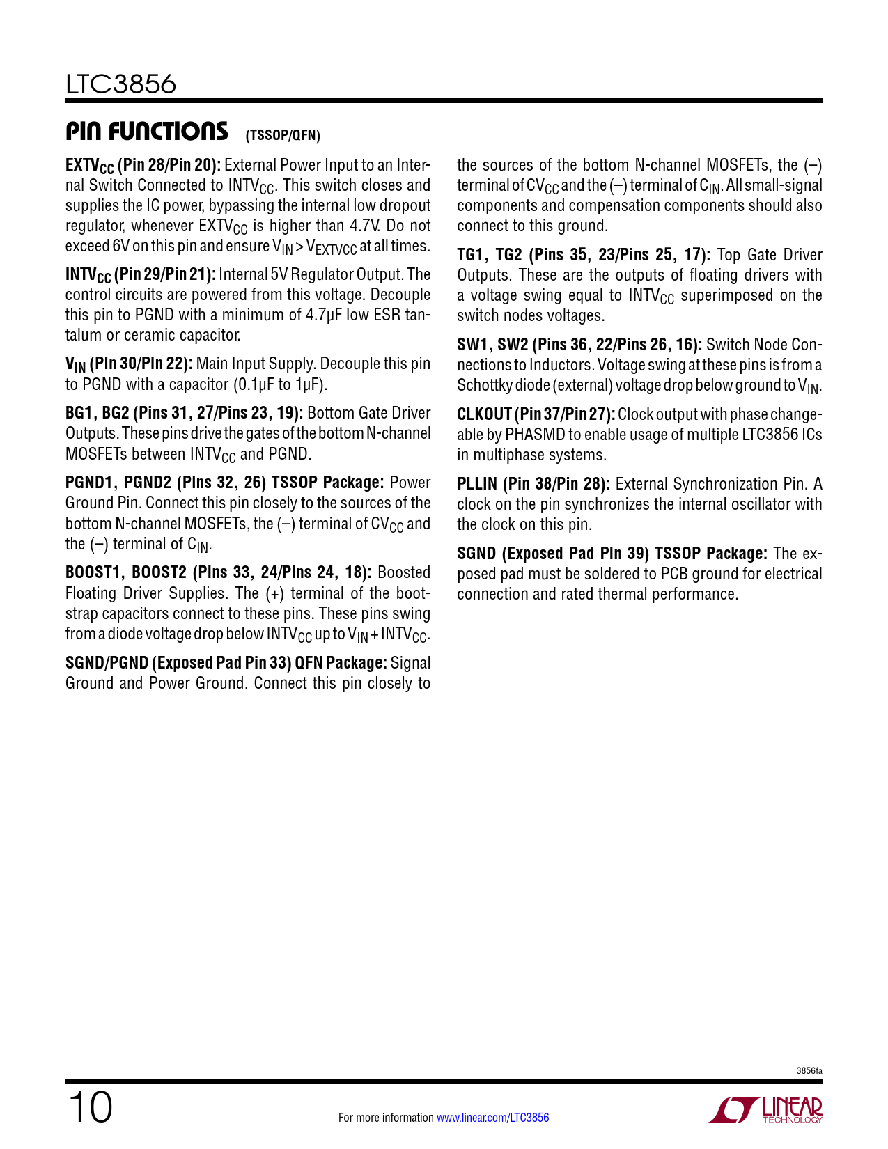 Signal Ground and Power Ground. Connect this pin closely to 3856fa 10 For more information www.linear.com/LTC3856 Document Outline Features Applications Description Typical Application Absolute Maximum Ratings Pin Configuration Order Information Electrical Characteristics Typical Performance Characteristics Pin Functions FUNCTIONAL Diagram Operation Applications Information Typical Application Typical Application Related Parts