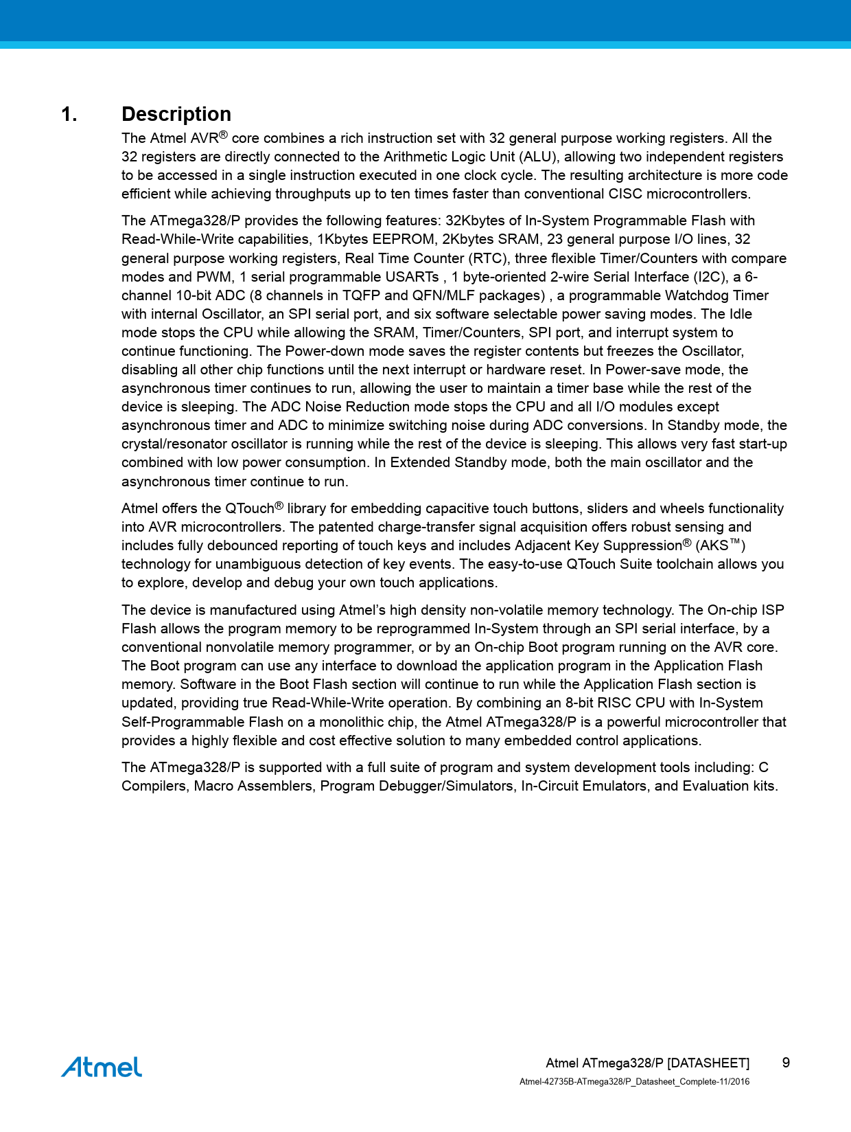 1.Description The Atmel AVR® core combines a rich instruction set with 32 general purpose working registers. All the 32 registers are directly connected to the Arithmetic Logic Unit (ALU), allowing two independent registers to be accessed in a single instruction executed in one clock cycle. The resulting architecture is more code efficient while achieving throughputs up to ten times faster than conventional CISC microcontrollers. The ATmega328/P provides the following features: 32Kbytes of In-System Programmable Flash with Read-While-Write capabilities, 1Kbytes EEPROM, 2Kbytes SRAM, 23 general purpose I/O lines, 32 general purpose working registers, Real Time Counter (RTC), three flexible Timer/Counters with compare modes and PWM, 1 serial programmable USARTs , 1 byte-oriented 2-wire Serial Interface (I2C), a 6- channel 10-bit ADC (8 channels in TQFP and QFN/MLF packages) , a programmable Watchdog Timer with internal Oscillator, an SPI serial port, and six software selectable power saving modes. The Idle mode stops the CPU while allowing the SRAM, Timer/Counters, SPI port, and interrupt system to continue functioning. The Power-down mode saves the register contents but freezes the Oscillator, disabling all other chip functions until the next interrupt or hardware reset. In Power-save mode, the asynchronous timer continues to run, allowing the user to maintain a timer base while the rest of the device is sleeping. The ADC Noise Reduction mode stops the CPU and all I/O modules except asynchronous timer and ADC to minimize switching noise during ADC conversions. In Standby mode, the crystal/resonator oscillator is running while the rest of the device is sleeping. This allows very fast start-up combined with low power consumption. In Extended Standby mode, both the main oscillator and the asynchronous timer continue to run. Atmel offers the QTouch® library for embedding capacitive touch buttons, sliders and wheels functionality into AVR microcontrollers. The patented charge-transfer signal acquisition offers robust sensing and includes fully debounced reporting of touch keys and includes Adjacent Key Suppression® (AKS™) technology for unambiguous detection of key events. The easy-to-use QTouch Suite toolchain allows you to explore, develop and debug your own touch applications. The device is manufactured using Atmel’s high density non-volatile memory technology. The On-chip ISP Flash allows the program memory to be reprogrammed In-System through an SPI serial interface, by a conventional nonvolatile memory programmer, or by an On-chip Boot program running on the AVR core. The Boot program can use any interface to download the application program in the Application Flash memory. Software in the Boot Flash section will continue to run while the Application Flash section is updated, providing true Read-While-Write operation. By combining an 8-bit RISC CPU with In-System Self-Programmable Flash on a monolithic chip, the Atmel ATmega328/P is a powerful microcontroller that provides a highly flexible and cost effective solution to many embedded control applications. The ATmega328/P is supported with a full suite of program and system development tools including: C Compilers, Macro Assemblers, Program Debugger/Simulators, In-Circuit Emulators, and Evaluation kits. Atmel ATmega328/P [DATASHEET] 9 Atmel-42735B-ATmega328/P_Datasheet_Complete-11/2016 Document Outline Introduction Feature Table of Contents 1. Description 2. Configuration Summary 3. Ordering Information 3.1. ATmega328 3.2. ATmega328P 4. Block Diagram 5. Pin Configurations 5.1. Pin-out 5.2. Pin Descriptions 5.2.1. VCC 5.2.2. GND 5.2.3. Port B (PB[7:0]) XTAL1/XTAL2/TOSC1/TOSC2 5.2.4. Port C (PC[5:0]) 5.2.5. PC6/RESET 5.2.6. Port D (PD[7:0]) 5.2.7. AVCC 5.2.8. AREF 5.2.9. ADC[7:6] (TQFP and VFQFN Package Only) 6. I/O Multiplexing 7. Resources 8. Data Retention 9. About Code Examples 10. Capacitive Touch Sensing 10.1. QTouch Library 11. AVR CPU Core 11.1. Overview 11.2. ALU – Arithmetic Logic Unit 11.3. Status Register 11.3.1. Status Register 11.4. General Purpose Register File 11.4.1. The X-register, Y-register, and Z-register 11.5. Stack Pointer 11.5.1. Stack Pointer Register High byte 11.5.2. Stack Pointer Register Low byte 11.6. Instruction Execution Timing 11.7. Reset and Interrupt Handling 11.7.1. Interrupt Response Time 12. AVR Memories 12.1. Overview 12.2. In-System Reprogrammable Flash Program Memory 12.3. SRAM Data Memory 12.3.1. Data Memory Access Times 12.4. EEPROM Data Memory 12.4.1. EEPROM Read/Write Access 12.4.2. Preventing EEPROM Corruption 12.5. I/O Memory 12.5.1. General Purpose I/O Registers 12.6. Register Description 12.6.1. EEPROM Address Register High 12.6.2. EEPROM Address Register Low 12.6.3. EEPROM Data Register 12.6.4. EEPROM Control Register 12.6.5. GPIOR2 – General Purpose I/O Register 2 12.6.6. GPIOR1 – General Purpose I/O Register 1 12.6.7. GPIOR0 – General Purpose I/O Register 0 13. System Clock and Clock Options 13.1. Clock Systems and Their Distribution 13.1.1. CPU Clock – clkCPU 13.1.2. I/O Clock – clkI/O 13.1.3. Flash Clock – clkFLASH 13.1.4. Asynchronous Timer Clock – clkASY 13.1.5. ADC Clock – clkADC 13.2. Clock Sources 13.2.1. Default Clock Source 13.2.2. Clock Startup Sequence 13.2.3. Low Power Crystal Oscillator 13.3. Low Power Crystal Oscillator 13.4. Full Swing Crystal Oscillator 13.5. Low Frequency Crystal Oscillator 13.6. Calibrated Internal RC Oscillator 13.7. 128kHz Internal Oscillator 13.8. External Clock 13.9. Timer/Counter Oscillator 13.10. Clock Output Buffer 13.11. System Clock Prescaler 13.12. Register Description 13.12.1. Oscillator Calibration Register 13.12.2. Clock Prescaler Register 14. PM - Power Management and Sleep Modes 14.1. Overview 14.2. Sleep Modes 14.3. BOD Disable 14.4. Idle Mode 14.5. ADC Noise Reduction Mode 14.6. Power-Down Mode 14.7. Power-save Mode 14.8. Standby Mode 14.9. Extended Standby Mode 14.10. Power Reduction Register 14.11. Minimizing P