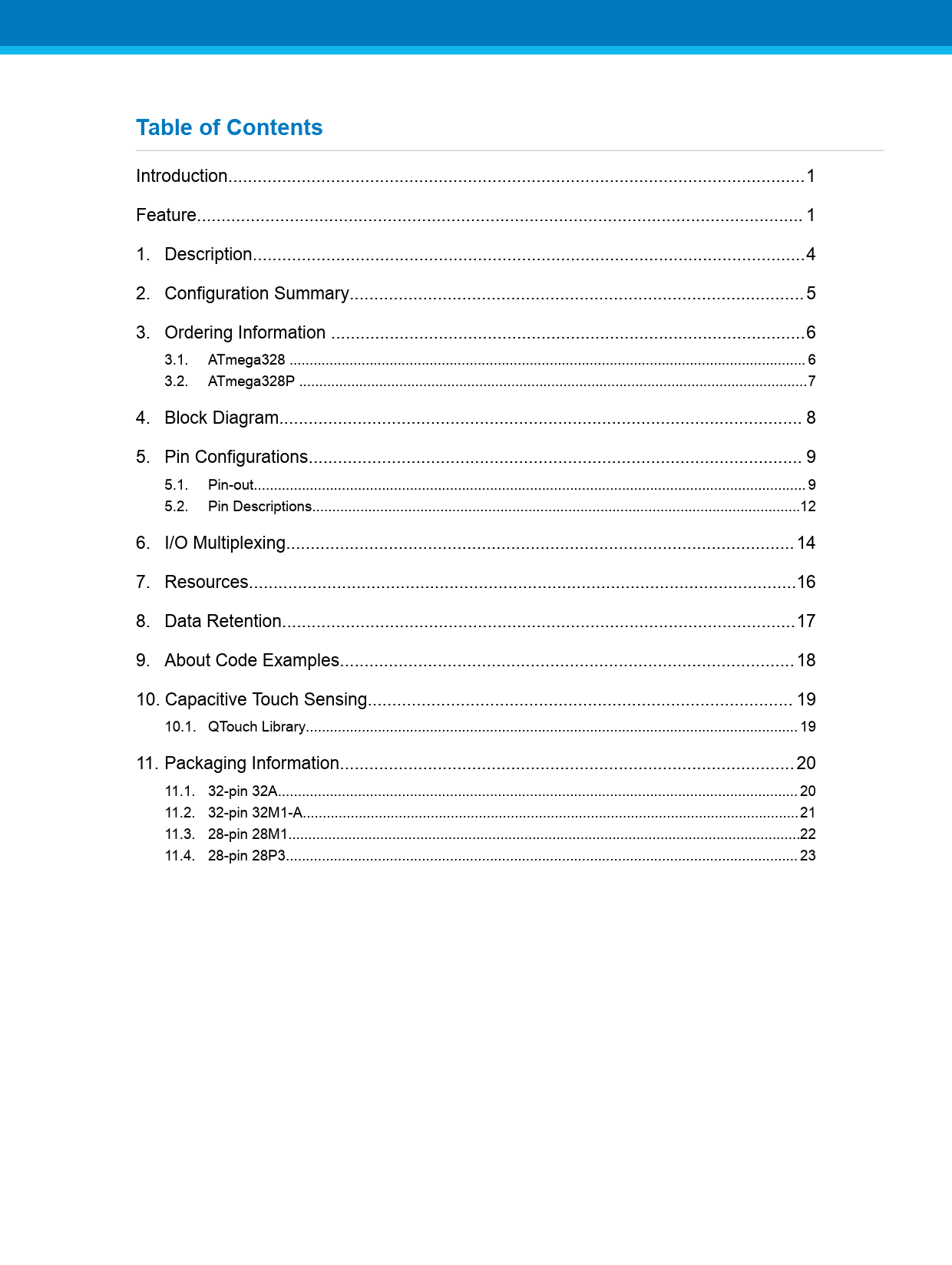 Introduction..1 Feature.. 1 1. Description...4 2. Configuration Summary... 5 3. Ordering Information ...6 3.1. ATmega328 ... 6 3.2. ATmega328P ...7 4. Block Diagram... 8 5. Pin Configurations... 9 5.1. Pin-out.. 9 5.2. Pin Descriptions..12 6. I/O Multiplexing.. 14 7. Resources..16 8. Data Retention...17 9. About Code Examples... 18 10. Capacitive Touch Sensing... 19 10.1. QTouch Library... 19 11. Packaging Information... 20 11.1. 32-pin 32A.. 20 11.2. 32-pin 32M1-A..21 11.3. 28-pin 28M1..22 11.4. 28-pin 28P3.. 23 Document Outline Introduction Feature Table of Contents 1. Description 2. Configuration Summary 3. Ordering Information 3.1. ATmega328 3.2. ATmega328P 4. Block Diagram 5. Pin Configurations 5.1. Pin-out 5.2. Pin Descriptions 5.2.1. VCC 5.2.2. GND 5.2.3. Port B (PB[7:0]) XTAL1/XTAL2/TOSC1/TOSC2 5.2.4. Port C (PC[5:0]) 5.2.5. PC6/RESET 5.2.6. Port D (PD[7:0]) 5.2.7. AVCC 5.2.8. AREF 5.2.9. ADC[7:6] (TQFP and VFQFN Package Only) 6. I/O Multiplexing 7. Resources 8. Data Retention 9. About Code Examples 10. Capacitive Touch Sensing 10.1. QTouch Library 11. Packaging Information 11.1. 32-pin 32A 11.2. 32-pin 32M1-A 11.3. 28-pin 28M1 11.4. 28-pin 28P3