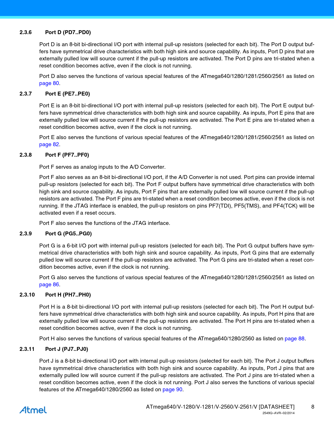 link to page 80 link to page 82 link to page 86 link to page 88 link to page 90 2.3.6Port D (PD7..PD0) Port D is an 8-bit bi-directional I/O port with internal pull-up resistors (selected for each bit). The Port D output buf- fers have symmetrical drive characteristics with both high sink and source capability. As inputs, Port D pins that are externally pulled low will source current if the pull-up resistors are activated. The Port D pins are tri-stated when a reset condition becomes active, even if the clock is not running. Port D also serves the functions of various special features of the ATmega640/1280/1281/2560/2561 as listed on page 80. 2.3.7Port E (PE7..PE0) Port E is an 8-bit bi-directional I/O port with internal pull-up resistors (selected for each bit). The Port E output buf- fers have symmetrical drive characteristics with both high sink and source capability. As inputs, Port E pins that are externally pulled low will source current if the pull-up resistors are activated. The Port E pins are tri-stated when a reset condition becomes active, even if the clock is not running. Port E also serves the functions of various special features of the ATmega640/1280/1281/2560/2561 as listed on page 82. 2.3.8Port F (PF7..PF0) Port F serves as analog inputs to the A/D Converter. Port F also serves as an 8-bit bi-directional I/O port, if the A/D Converter is not used. Port pins can provide internal pull-up resistors (selected for each bit). The Port F output buffers have symmetrical drive characteristics with both high sink and source capability. As inputs, Port F pins that are externally pulled low will source current if the pull-up resistors are activated. The Port F pins are tri-stated when a reset condition becomes active, even if the clock is not running. If the JTAG interface is enabled, the pull-up resistors on pins PF7(TDI), PF5(TMS), and PF4(TCK) will be activated even if a reset occurs. Port F also serves the functions of the JTAG interface. 2.3.9Port G (PG5..PG0) Port G is a 6-bit I/O port with internal pull-up resistors (selected for each bit). The Port G output buffers have sym- metrical drive characteristics with both high sink and source capability. As inputs, Port G pins that are externally pulled low will source current if the pull-up resistors are activated. The Port G pins are tri-stated when a reset con- dition becomes active, even if the clock is not running. Port G also serves the functions of various special features of the ATmega640/1280/1281/2560/2561 as listed on page 86. 2.3.10Port H (PH7..PH0) Port H is a 8-bit bi-directional I/O port with internal pull-up resistors (selected for each bit). The Port H output buf- fers have symmetrical drive characteristics with both high sink and source capability. As inputs, Port H pins that are externally pulled low will source current if the pull-up resistors are activated. The Port H pins are tri-stated when a reset condition becomes active, even if the clock is not running. Port H also serves the functions of various special features of the ATmega640/1280/2560 as listed on page 88. 2.3.11Port J (PJ7..PJ0) Port J is a 8-bit bi-directional I/O port with internal pull-up resistors (selected for each bit). The Port J output buffers have symmetrical drive characteristics with both high sink and source capability. As inputs, Port J pins that are externally pulled low will source current if the pull-up resistors are activated. The Port J pins are tri-stated when a reset condition becomes active, even if the clock is not running. Port J also serves the functions of various special features of the ATmega640/1280/2560 as listed on page 90. ATmega640/V-1280/V-1281/V-2560/V-2561/V [DATASHEET] 8 2549Q–AVR–02/2014 Document Outline 1. Pin Configurations 2. Overview 2.1 Block Diagram 2.2 Comparison Between ATmega1281/2561 and ATmega640/1280/2560 2.3 Pin Descriptions 2.3.1 VCC 2.3.2 GND 2.3.3 Port A (PA7..PA0) 2.3.4 Port B (PB7..PB0) 2.3.5 Port C (PC7..PC0) 2.3.6 Port D (PD7..PD0) 2.3.7 Port E (PE7..PE0) 2.3.8 Port F (PF7..PF0) 2.3.9 Port G (PG5..PG0) 2.3.10 Port H (PH7..PH0) 2.3.11 Port J (PJ7..PJ0) 2.3.12 Port K (PK7..PK0) 2.3.13 Port L (PL7..PL0) 2.3.14 RESET 2.3.15 XTAL1 2.3.16 XTAL2 2.3.17 AVCC 2.3.18 AREF 3. Resources 4. About Code Examples 5. Data Retention 6. Capacitive touch sensing 7. AVR CPU Core 7.1 Introduction 7.2 Architectural Overview 7.3 ALU – Arithmetic Logic Unit 7.4 Status Register 7.4.1 SREG – AVR Status Register 7.5 General Purpose Register File 7.5.1 The X-register, Y-register, and Z-register 7.6 Stack Pointer 7.6.1 RAMPZ – Extended Z-pointer Register for ELPM/SPM 7.6.2 EIND – Extended Indirect Register 7.7 Instruction Execution Timing 7.8 Reset and Interrupt Handling 7.8.1 Interrupt Response Time 8. AVR Memories 8.1 In-System Reprogrammable Flash Program Memory 8.2 SRAM Data Memory 8.2.1 Data Memory Access Times 8.3 EEPROM Data Memory 8.3.1 EEPROM Read/Write Access 8.3.2 Preventing EEPROM Corruption 8.4 I/O Memory 8.4.1 General Purpose I/O Registers 9. External Memory Interface 9.1 Overview 9.1.1 Using the External Memory Interface 9.1.2 Address Latch Requirements 9.1.3 Pull-up and Bus-keeper 9.1.4 Timing 9.1.5 Using all Locations of External Memory Smaller than 64Kbytes 9.1.6 Using all 64Kbytes Locations of External Memory 9.2 Register Description 9.2.1 EEPROM registers 9.3 General Purpose registers 9.3.1 GPIOR2 – General Purpose I/O Register 2 9.3.2 GPIOR1 – General Purpose I/O Register 1 9.3.3 GPIOR0 – General Purpose I/O Register 0 9.4 External Memory registers 9.4.1 XMCRA – External Memory Control Register A 9.4.2 XMCRB – External Memory Control Register B 10. System Clock and Clock Options 10.1 Overview 10.2 Clock Systems and their Distribution 10.2.1 CPU Clock – clkCPU 10.2.2 I/O Clock – clkI/O 10.2.3 Flash Clock – clkFLASH 10.2.4 Asynchronous Timer Clock – clkASY 10.2.5 ADC Clock – clkADC 10.3 Clock Sources 10.3.1 Default Clock Source 10.3.2 Clock Start-up Sequence 10.4 Low Powe