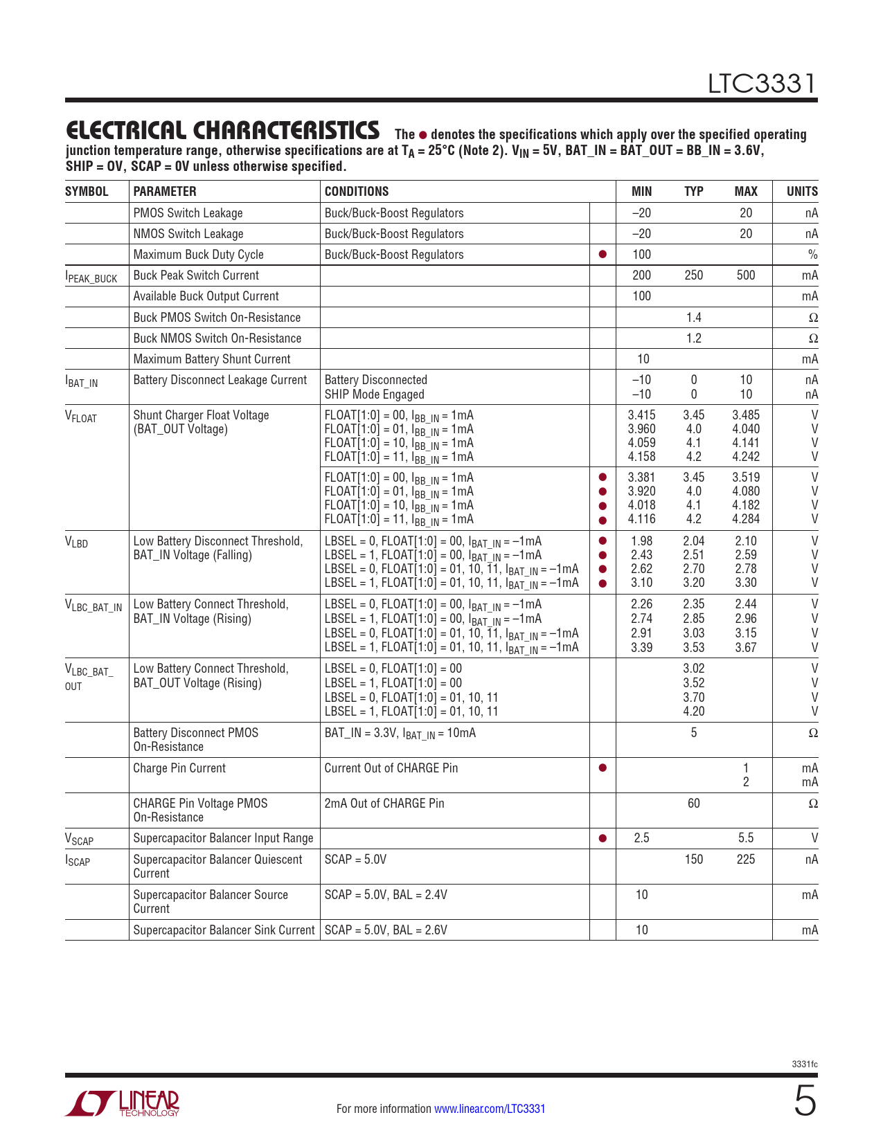 denotes the specifications which apply over the specified operating junction temperature range, otherwise specifications are at TA = 25°C (Note 2). VIN = 5V, BAT_IN = BAT_OUT = BB_IN = 3.6V, SHIP = OV, SCAP = 0V unless otherwise specified. SYMBOL PARAMETER CONDITIONS MIN TYP MAX UNITS