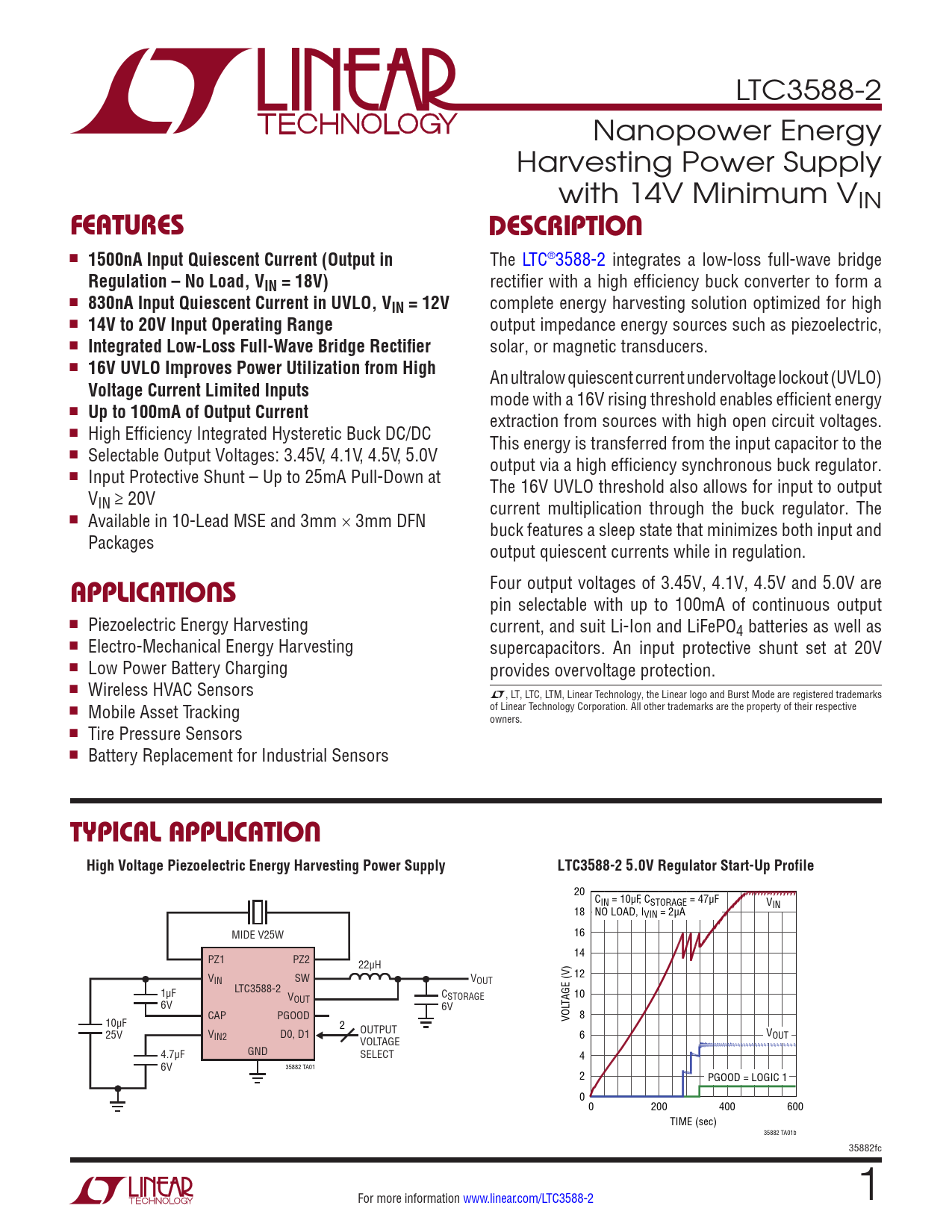 LTC3588-2 Nanopower Energy Harvesting Power Supply with 14V Minimum VIN FEATURESDESCRIPTION n 1500nA Input Quiescent Current (Output in The LTC®3588-2 integrates a low-loss full-wave bridge Regulation – No Load, VIN = 18V) rectifier with a high efficiency buck converter to form a n 830nA Input Quiescent Current in UVLO, VIN = 12V complete energy harvesting solution optimized for high n 14V to 20V Input Operating Range output impedance energy sources such as piezoelectric, n Integrated Low-Loss Full-Wave Bridge Rectifier solar, or magnetic transducers. n 16V UVLO Improves Power Utilization from High An ultralow quiescent current undervoltage lockout (UVLO) Voltage Current Limited Inputs mode with a 16V rising threshold enables efficient energy n Up to 100mA of Output Current extraction from sources with high open circuit voltages. n High Efficiency Integrated Hysteretic Buck DC/DC This energy is transferred from the input capacitor to the n Selectable Output Voltages: 3.45V, 4.1V, 4.5V, 5.0V output via a high efficiency synchronous buck regulator. n Input Protective Shunt – Up to 25mA Pull-Down at The 16V UVLO threshold also allows for input to output VIN ≥ 20V current multiplication through the buck regulator. The n Available in 10-Lead MSE and 3mm × 3mm DFN buck features a sleep state that minimizes both input and Packages output quiescent currents while in regulation. Four output voltages of 3.45V, 4.1V, 4.5V and 5.0V are APPLICATIONS pin selectable with up to 100mA of continuous output n Piezoelectric Energy Harvesting current, and suit Li-Ion and LiFePO4 batteries as well as n Electro-Mechanical Energy Harvesting supercapacitors. An input protective shunt set at 20V n Low Power Battery Charging provides overvoltage protection. n Wireless HVAC Sensors L, LT, LTC, LTM, Linear Technology, the Linear logo and Burst Mode are registered trademarks of Linear Technology Corporation. All other trademarks are the property of their respective n Mobile Asset Tracking owners. n Tire Pressure Sensors n Battery Replacement for Industrial Sensors TYPICAL APPLICATIONHigh Voltage Piezoelectric Energy Harvesting Power SupplyLTC3588-2 5.0V Regulator Start-Up Profile 20 CIN = 10µF, CSTORAGE = 47µF VIN 18 NO LOAD, IVIN = 2µA MIDE V25W 16 14 PZ1 PZ2 22µH V 12 IN SW VOUT LTC3588-2 1µF V C 10 OUT STORAGE 6V 6V TAGE (V) CAP PGOOD 8 10µF VOL 2 25V V OUTPUT IN2 D0, D1 6 V VOLTAGE OUT GND 4.7µF SELECT 4 6V 35882 TA01 2 PGOOD = LOGIC 1 0 0 200 400 600 TIME (sec) 35882 TA01b 35882fc For more information www.linear.com/LTC3588-2 1 Document Outline Features Applications Description Typical Application Absolute Maximum Ratings Pin Configuration Order Information Electrical Characteristics Typical Performance Characteristics Pin Functions Block Diagram Operation Applications Information Revision History Typical Application Related Parts