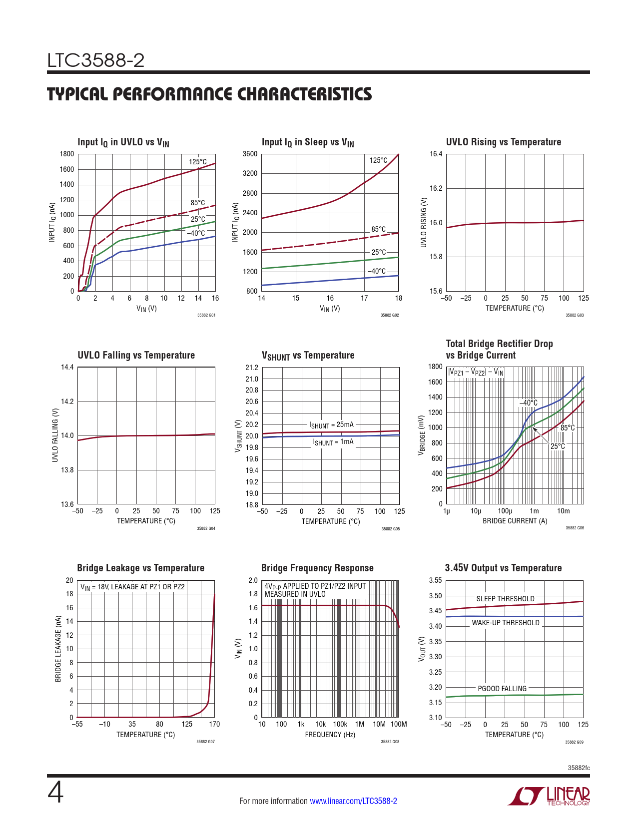 20 2.0 3.55 VIN = 18V, LEAKAGE AT PZ1 OR PZ2 4VP-P APPLIED TO PZ1/PZ2 INPUT 18 1.8 MEASURED IN UVLO 3.50 SLEEP THRESHOLD 16 1.6 3.45 14 1.4 3.40 WAKE-UP THRESHOLD 12 1.2 3.35 10 (V) 1.0 (V) V IN 3.30 8 0.8 V OUT 3.25 BRIDGE LEAKAGE (nA) 6 0.6 4 0.4 3.20 PGOOD FALLING 2 0.2 3.15 0 0 3.10 –55 –10 35 80 125 170 10 100 1k 10k 100k 1M 10M 100M –50 –25 0 25 50 75 100 125 TEMPERATURE (°C) FREQUENCY (Hz) TEMPERATURE (°C) 35882 G07 35882 G08 35882 G09 35882fc 4 For more information www.linear.com/LTC3588-2 Document Outline Features Applications Description Typical Application Absolute Maximum Ratings Pin Configuration Order Information Electrical Characteristics Typical Performance Characteristics Pin Functions Block Diagram Operation Applications Information Revision History Typical Application Related Parts