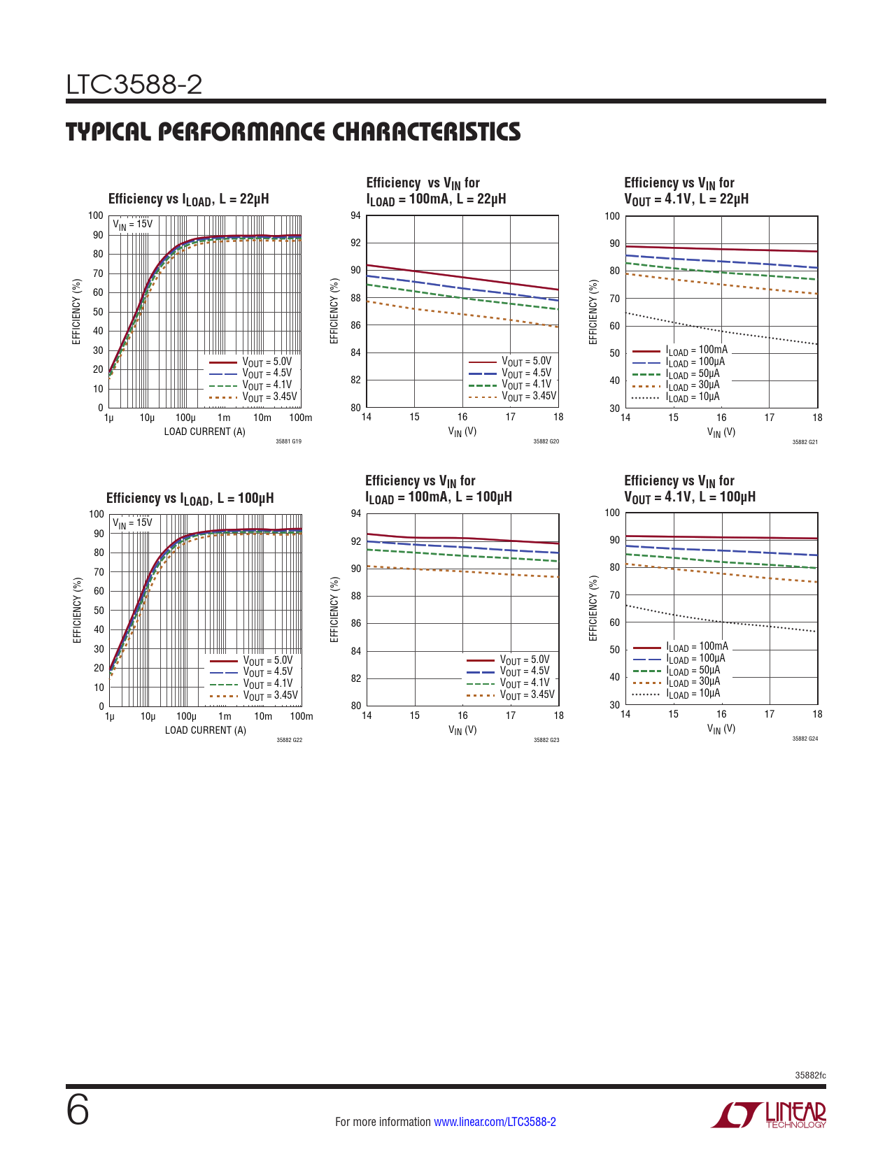 100 94 100 VIN = 15V 90 92 90 80 70 90 80 60 88 70 50 60 40 86 EFFICIENCY (%) EFFICIENCY (%) EFFICIENCY (%) 30 84 50 ILOAD = 100mA V V ILOAD = 100µA 20 OUT = 5.0V OUT = 5.0V VOUT = 4.5V V I 82 OUT = 4.5V 40 LOAD = 50µA 10 VOUT = 4.1V VOUT = 4.1V ILOAD = 30µA VOUT = 3.45V VOUT = 3.45V ILOAD = 10µA 0 80 30 1µ 10µ 100µ 1m 10m 100m 14 15 16 17 18 14 15 16 17 18 LOAD CURRENT (A) VIN (V) VIN (V) 35882 G22 35882 G23 35882 G24 35882fc 6 For more information www.linear.com/LTC3588-2 Document Outline Features Applications Description Typical Application Absolute Maximum Ratings Pin Configuration Order Information Electrical Characteristics Typical Performance Characteristics Pin Functions Block Diagram Operation Applications Information Revision History Typical Application Related Parts
