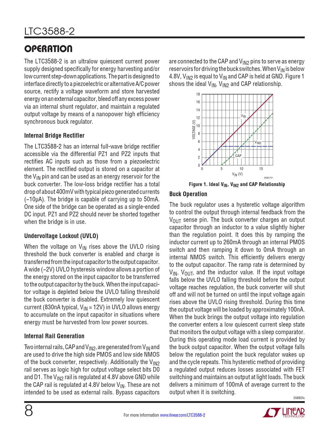 TAGE (V) 8 VOL 6 V The LTC3588-2 has an internal full-wave bridge rectifier IN2 4 accessible via the differential PZ1 and PZ2 inputs that CAP rectifies AC inputs such as those from a piezoelectric 2 element. The rectified output is stored on a capacitor at 0 0 5 10 15 the V V IN pin and can be used as an energy reservoir for the IN (V) 35882 F01 buck converter. The low-loss bridge rectifier has a total