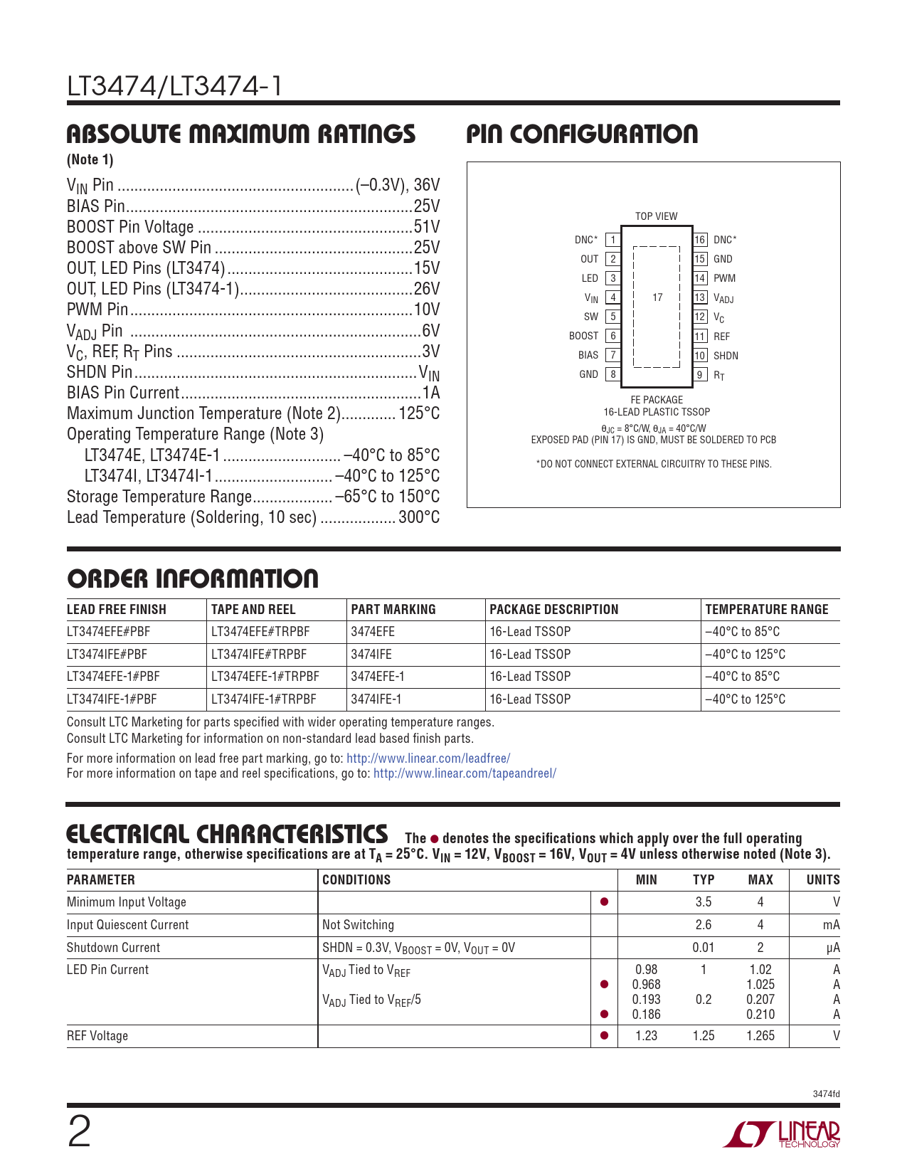 LT3474EFE#PBF LT3474EFE#TRPBF 3474EFE 16-Lead TSSOP –40°C to 85°C LT3474IFE#PBF LT3474IFE#TRPBF 3474IFE 16-Lead TSSOP –40°C to 125°C LT3474EFE-1#PBF LT3474EFE-1#TRPBF 3474EFE-1 16-Lead TSSOP –40°C to 85°C LT3474IFE-1#PBF LT3474IFE-1#TRPBF 3474IFE-1 16-Lead TSSOP –40°C to 125°C Consult LTC Marketing for parts specifi ed with wider operating temperature ranges. Consult LTC Marketing for information on non-standard lead based fi nish parts. For more information on lead free part marking, go to: http://www.linear.com/leadfree/ For more information on tape and reel specifi cations, go to: http://www.linear.com/tapeandreel/