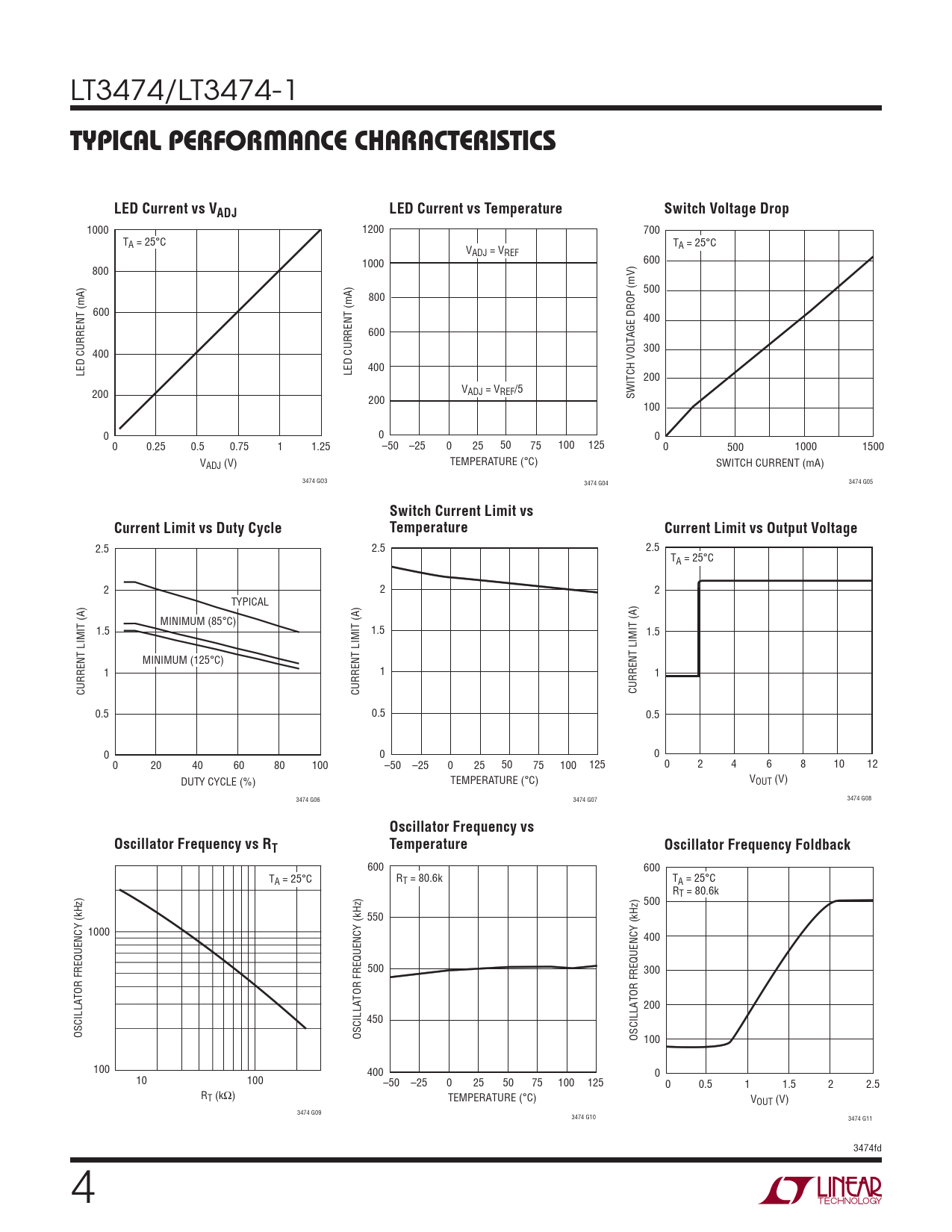 1000 1200 700 TA = 25°C T V A = 25°C ADJ = VREF 1000 600 800 500 800 600 400 600 TAGE DROP (mV) 300 400 400 LED CURRENT (mA) LED CURRENT (mA) 200 V 200 ADJ = VREF/5 200 SWITCH VOL 100 0 0 0 0 0.25 0.5 0.75 1 1.25 –50 –25 0 25 50 75 100 125 0 500 1000 1500 VADJ (V) TEMPERATURE (°C) SWITCH CURRENT (mA) 3474 GO3 3474 G04 3474 G05