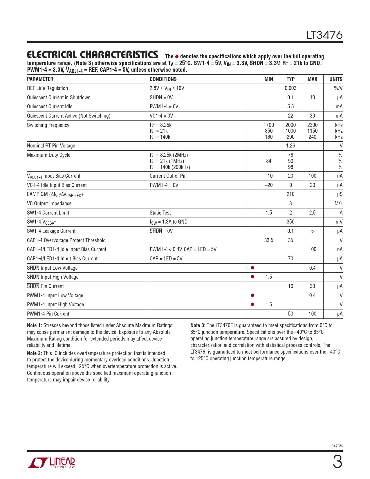 LT3476 electricAl chArActeristicsThe l denotes the specifications which apply over the full operatingtemperature range, (Note 3) otherwise specifications are at TA = 25°C. SW1-4 = 5V, VIN = 3.3V, SHDN = 3.3V, RT = 21k to GND,PWM1-4 = 3.3V, VADJ1-4 = REF, CAP1-4 = 5V, unless otherwise noted.PARAMETERCONDITIONSMINTYPMAXUNITS REF Line Regulation 2.8V ≤ VIN ≤ 16V 0.003 %/V Quiescent Current in Shutdown SHDN = 0V 0.1 10 µA Quiescent Current Idle PWM1-4 = 0V 5.5 mA Quiescent Current Active (Not Switching) VC1-4 = 0V 22 30 mA Switching Frequency RT = 8.25k 1700 2000 2300 kHz RT = 21k 850 1000 1150 kHz RT = 140k 160 200 240 kHz Nominal RT Pin Voltage 1.26 V Maximum Duty Cycle RT = 8.25k (2MHz) 76 % RT = 21k (1MHz) 84 90 % RT = 140k (200kHz) 98 % VADJ1-4 Input Bias Current Current Out of Pin –10 20 100 nA VC1-4 Idle Input Bias Current PWM1-4 = 0V –20 0 20 nA EAMP GM (∆IVC/∆VCAP-LED) 210 µS VC Output Impedance 3 MΩ SW1-4 Current Limit Static Test 1.5 2 2.5 A SW1-4 VCESAT ISW = 1.3A to GND 350 mV SW1-4 Leakage Current SHDN = 0V 0.1 5 µA CAP1-4 Overvoltage Protect Threshold 33.5 35 V CAP1-4/LED1-4 Idle Input Bias Current PWM1-4 < 0.4V, CAP = LED = 5V 100 nA CAP1-4/LED1-4 Input Bias Current CAP = LED = 5V 70 µA SHDN Input Low Voltage l 0.4 V SHDN Input High Voltage l 1.5 V SHDN Pin Current 16 30 µA PWM1-4 Input Low Voltage l 0.4 V PWM1-4 Input High Voltage l 1.5 V PWM1-4 Pin Current 50 100 µA Note 1: Stresses beyond those listed under Absolute Maximum Ratings Note 3: The LT3476E is guaranteed to meet specifications from 0°C to may cause permanent damage to the device. Exposure to any Absolute 85°C junction temperature. Specifications over the –40°C to 85°C Maximum Rating condition for extended periods may affect device operating junction temperature range are assured by design, reliability and lifetime. characterization and correlation with statistical process controls. The Note 2: This IC includes overtemperature protection that is intended LT3476I is guaranteed to meet performance specifications over the –40°C to protect the device during momentary overload conditions. Junction to 125°C operating junction temperature range. temperature will exceed 125°C when overtemperature protection is active. Continuous operation above the specified maximum operating junction temperature may impair device reliability. 3476fb 3 Document Outline Features Applications Description Typical Application Absolute Maximum Ratings Pin Configuration Order Information Electrical Characteristics Typical Performance Characteristics Pin Functions Block Diagram Operation Applications Information Typical Applications Package Description Revision History Typical Application Related Parts