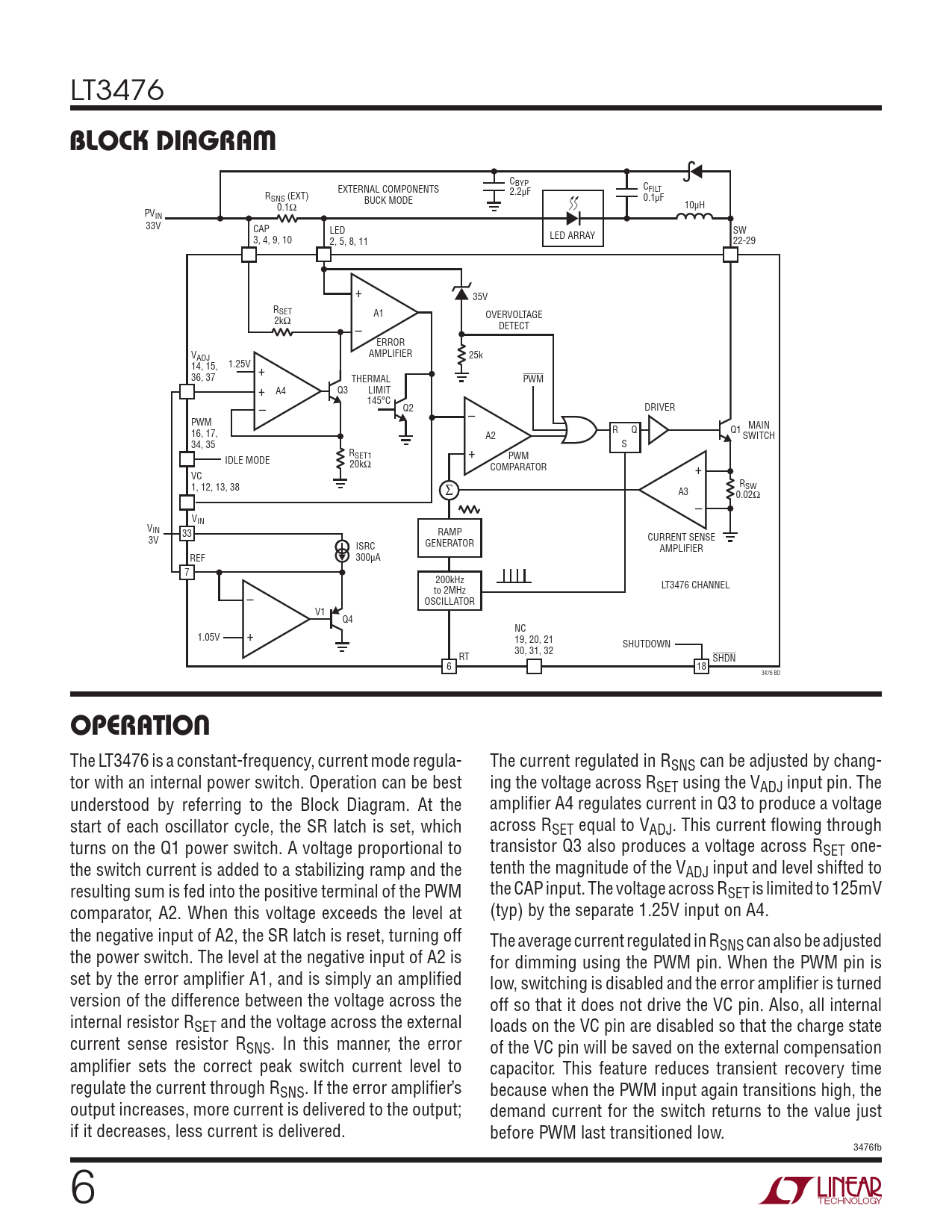 LT3476 block DiAgrAM C EXTERNAL COMPONENTS BYP R 2.2µF CFILT SNS (EXT) BUCK MODE 0.1µF 0.1Ω 10µH PVIN 33V CAP LED SW 3, 4, 9, 10 2, 5, 8, 11 LED ARRAY 22-29 + 35V RSET A1 OVERVOLTAGE 2kΩ DETECT – ERROR V AMPLIFIER ADJ 25k 14, 15, 1.25V + 36, 37 THERMAL PWM + A4 Q3 LIMIT – 145°C Q2 – DRIVER PWM 16, 17, R Q Q1 MAIN A2 SWITCH 34, 35 + S R SET1 IDLE MODE PWM 20kΩ COMPARATOR + VC 1, 12, 13, 38 RSW ∑ A3 0.02Ω – VIN VIN 33 RAMP 3V CURRENT SENSE GENERATOR ISRC AMPLIFIER REF 300µA 7 200kHz – to 2MHz LT3476 CHANNEL OSCILLATOR V1 Q4 + NC 1.05V 19, 20, 21 SHUTDOWN 30, 31, 32 RT SHDN 6 18 3476 BD operAtion The LT3476 is a constant-frequency, current mode regula- The current regulated in RSNS can be adjusted by chang- tor with an internal power switch. Operation can be best ing the voltage across RSET using the VADJ input pin. The understood by referring to the Block Diagram. At the amplifier A4 regulates current in Q3 to produce a voltage start of each oscillator cycle, the SR latch is set, which across RSET equal to VADJ. This current flowing through turns on the Q1 power switch. A voltage proportional to transistor Q3 also produces a voltage across RSET one- the switch current is added to a stabilizing ramp and the tenth the magnitude of the VADJ input and level shifted to resulting sum is fed into the positive terminal of the PWM the CAP input. The voltage across RSET is limited to 125mV comparator, A2. When this voltage exceeds the level at (typ) by the separate 1.25V input on A4. the negative input of A2, the SR latch is reset, turning off The average current regulated in R the power switch. The level at the negative input of A2 is SNS can also be adjusted for dimming using the PWM pin. When the PWM pin is set by the error amplifier A1, and is simply an amplified low, switching is disabled and the error amplifier is turned version of the difference between the voltage across the off so that it does not drive the VC pin. Also, all internal internal resistor RSET and the voltage across the external loads on the VC pin are disabled so that the charge state current sense resistor RSNS. In this manner, the error of the VC pin will be saved on the external compensation amplifier sets the correct peak switch current level to capacitor. This feature reduces transient recovery time regulate the current through RSNS. If the error amplifier’s because when the PWM input again transitions high, the output increases, more current is delivered to the output; demand current for the switch returns to the value just if it decreases, less current is delivered. before PWM last transitioned low. 3476fb 6 Document Outline Features Applications Description Typical Application Absolute Maximum Ratings Pin Configuration Order Information Electrical Characteristics Typical Performance Characteristics Pin Functions Block Diagram Operation Applications Information Typical Applications Package Description Revision History Typical Application Related Parts
