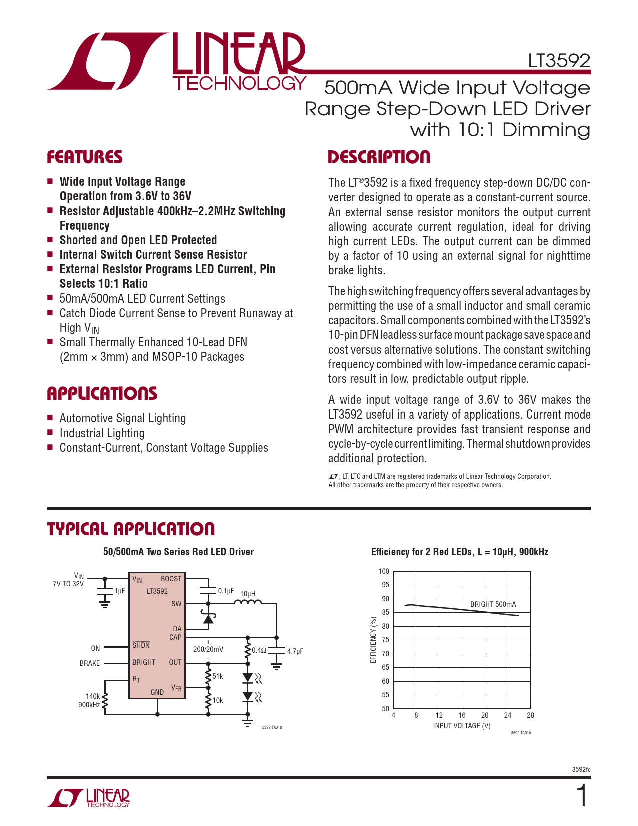 LT3592 500mA Wide Input Voltage Range Step-Down LED Driver with 10:1 Dimming FEATURESDESCRIPTION n Wide Input Voltage Range The LT®3592 is a fi xed frequency step-down DC/DC con- Operation from 3.6V to 36V verter designed to operate as a constant-current source. n Resistor Adjustable 400kHz–2.2MHz Switching An external sense resistor monitors the output current Frequency allowing accurate current regulation, ideal for driving n Shorted and Open LED Protected high current LEDs. The output current can be dimmed n Internal Switch Current Sense Resistor by a factor of 10 using an external signal for nighttime n External Resistor Programs LED Current, Pin brake lights. Selects 10:1 Ratio The high switching frequency offers several advantages by n 50mA/500mA LED Current Settings permitting the use of a small inductor and small ceramic n Catch Diode Current Sense to Prevent Runaway at capacitors. Small components combined with the LT3592’s High VIN 10-pin DFN leadless surface mount package save space and n Small Thermally Enhanced 10-Lead DFN cost versus alternative solutions. The constant switching (2mm × 3mm) and MSOP-10 Packages frequency combined with low-impedance ceramic capaci- tors result in low, predictable output ripple. APPLICATIONS A wide input voltage range of 3.6V to 36V makes the n LT3592 useful in a variety of applications. Current mode Automotive Signal Lighting n PWM architecture provides fast transient response and Industrial Lighting n cycle-by-cycle current limiting. Thermal shutdown provides Constant-Current, Constant Voltage Supplies additional protection. L, LT, LTC and LTM are registered trademarks of Linear Technology Corporation. All other trademarks are the property of their respective owners. TYPICAL APPLICATION50/500mA Two Series Red LED DriverEffi ciency for 2 Red LEDs, L = 10μH, 900kHz 100 VIN VIN BOOST 7V TO 32V 95 1μF LT3592 0.1μF 10μH 90 SW BRIGHT 500mA 85 DA 80 CAP 75 SHDN + ON 200/20mV 0.4Ω 4.7μF 70 – BRAKE BRIGHT OUT EFFICIENCY (%) 65 51k RT 60 VFB GND 140k 55 10k 900kHz 50 4 8 12 16 20 24 28 3592 TA01a INPUT VOLTAGE (V) 3592 TA01b 3592fc 1