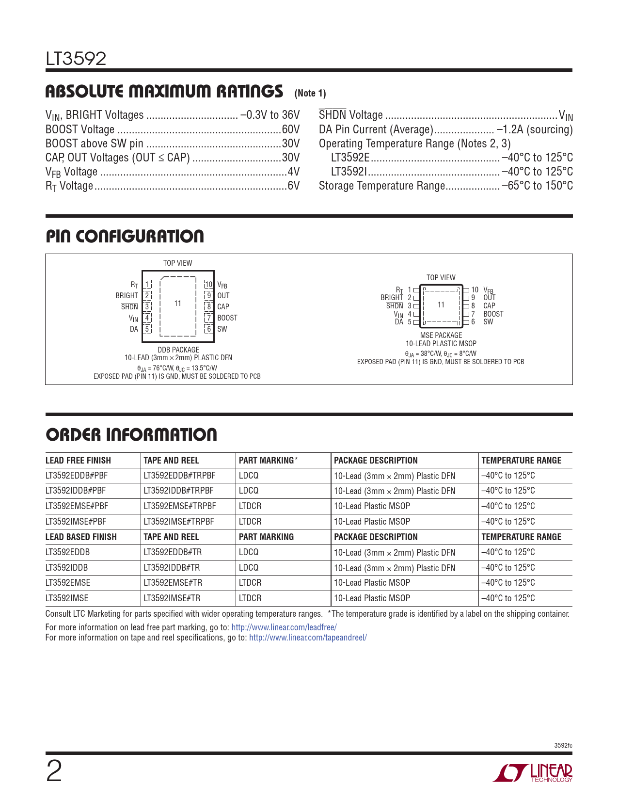 LT3592EDDB LT3592EDDB#TR LDCQ 10-Lead (3mm × 2mm) Plastic DFN –40°C to 125°C LT3592IDDB LT3592IDDB#TR LDCQ 10-Lead (3mm × 2mm) Plastic DFN –40°C to 125°C LT3592EMSE LT3592EMSE#TR LTDCR 10-Lead Plastic MSOP –40°C to 125°C LT3592IMSE LT3592IMSE#TR LTDCR 10-Lead Plastic MSOP –40°C to 125°C Consult LTC Marketing for parts specifi ed with wider operating temperature ranges. *The temperature grade is identifi ed by a label on the shipping container. For more information on lead free part marking, go to: http://www.linear.com/leadfree/ For more information on tape and reel specifi cations, go to: http://www.linear.com/tapeandreel/ 3592fc 2