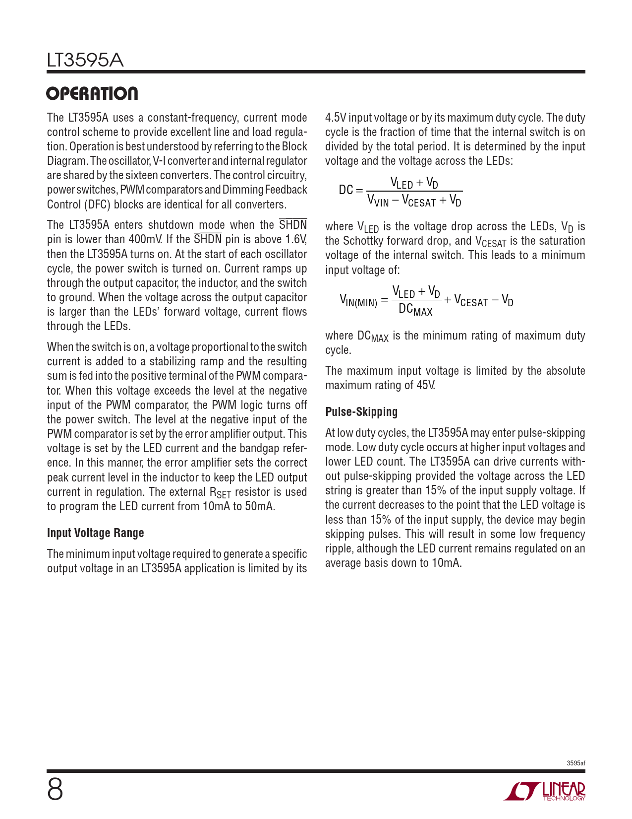 skipping pulses. This will result in some low frequency The minimum input voltage required to generate a specifi c ripple, although the LED current remains regulated on an output voltage in an LT3595A application is limited by its average basis down to 10mA. 3595af 8