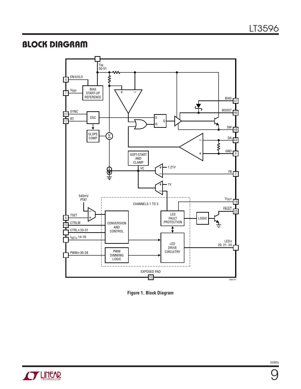 LT3596 block DiagraM VIN 50-51 EN/UVLO 4 V BIAS REF 7 START-UP + – REFERENCE BIAS 37 SYNC BOOST 27 46 RT OSC S 17 Q R SW 48 SLOPE COMP DA – 44 GND SOFT-START + 9 AND CLAMP + 1.21V VC FB – 2 + 1V – 540mV PTAT VOUT 19 CHANNELS 1 TO 3 – FAULT 25 TSET + LED 6 FAULT LOGIC CTRLM PROTECTION 13 CONVERSION AND CTRLn 33-31 CONTROL ISETn 14-16 LEDn LED 20, 21, 24 DRIVE PWMn 30-28 PWM CIRCUITRY DIMMING LOGIC EXPOSED PAD 53 3596 F01