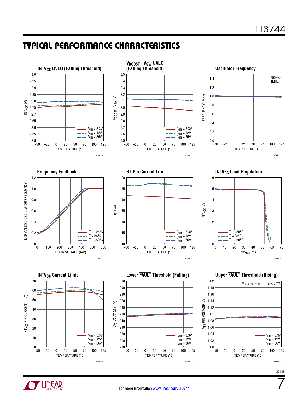1.2 70 6 1.0 65 5 0.8 60 4 (V) 0.6 (µA) 55 V CC 3 I RT INT 0.4 50 2 0.2 T = 125°C 45 VIN = 3.3V 1 T = 130°C T = 25°C V T = 25°C NORMALIZED OSCILLATOR FREQUENCY IN = 12V T = –50°C VIN = 36V T = –50°C 0 40 0 0 100 200 300 400 500 600 –50 –25 0 25 50 75 100 125 0 10 20 30 40 50 60 70 FB PIN VOLTAGE (mV) TEMPERATURE (°C) INTVCC (mA) 3744 G13 3744 G14 3744 G15