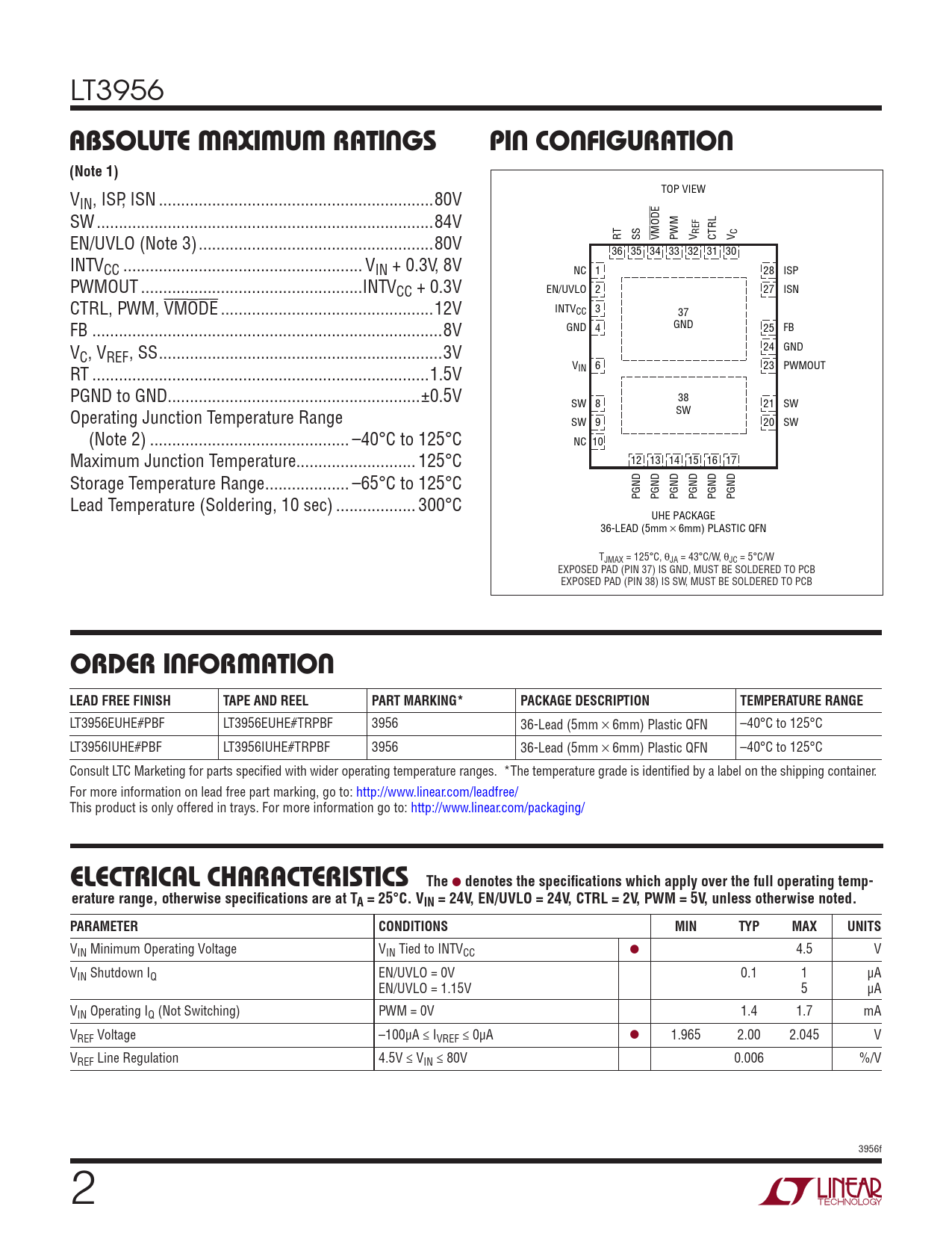 LT3956EUHE#PBF LT3956EUHE#TRPBF 3956 36-Lead (5mm × 6mm) Plastic QFN –40°C to 125°C LT3956IUHE#PBF LT3956IUHE#TRPBF 3956 36-Lead (5mm × 6mm) Plastic QFN –40°C to 125°C Consult LTC Marketing for parts specified with wider operating temperature ranges. *The temperature grade is identified by a label on the shipping container. For more information on lead free part marking, go to: http://www.linear.com/leadfree/ This product is only offered in trays. For more information go to: http://www.linear.com/packaging/ e lecTrical characTerisTics