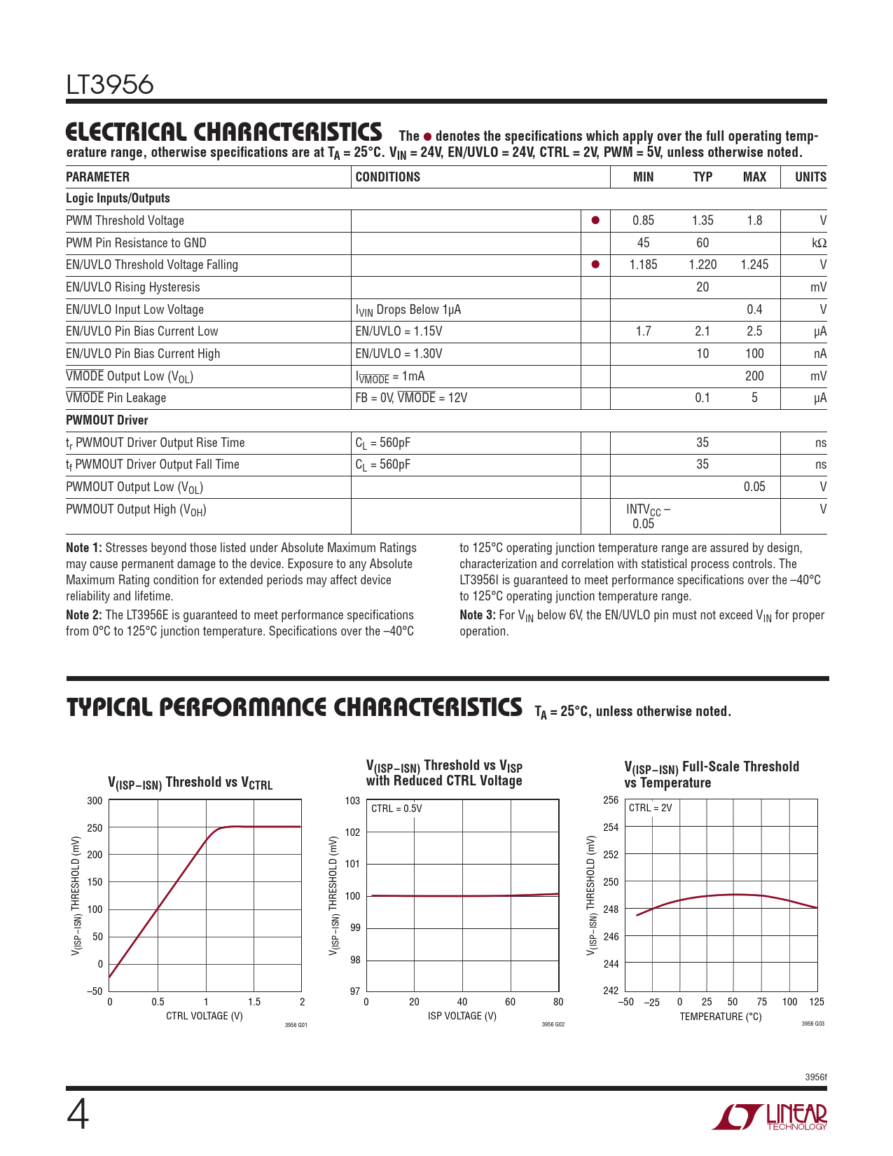 300 103 256 CTRL = 0.5V CTRL = 2V 250 102 254 200 252 101 150 250 100 THRESHOLD (mV) 100 THRESHOLD (mV) THRESHOLD (mV) 248 –ISN) –ISN) 99 –ISN) P 50 P P 246 V (IS V (IS V (IS 0 98 244 –50 97 242 0 0.5 1 1.5 2 0 20 40 60 80 –50 –25 0 25 50 75 100 125 CTRL VOLTAGE (V) ISP VOLTAGE (V) TEMPERATURE (°C) 3956 G01 3956 G02 3956 G03 3956f Document Outline Features Description Applications Typical Application Absolute Maximum Ratings Pin Configuration order information Electrical Characteristics Typical Performance Characteristics Pin Functions Block Diagram Operation Applications Information Typical Application Package Description Typical Application Related Parts
