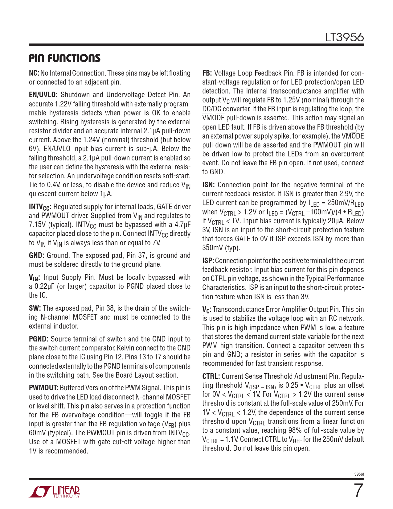 LT3956 pin FuncTions NC: No Internal Connection. These pins may be left floating FB: Voltage Loop Feedback Pin. FB is intended for con- or connected to an adjacent pin. stant-voltage regulation or for LED protection/open LED detection. The internal transconductance amplifier with EN/UVLO: Shutdown and Undervoltage Detect Pin. An output VC will regulate FB to 1.25V (nominal) through the accurate 1.22V falling threshold with externally program- DC/DC converter. If the FB input is regulating the loop, the mable hysteresis detects when power is OK to enable VMODE pull-down is asserted. This action may signal an switching. Rising hysteresis is generated by the external open LED fault. If FB is driven above the FB threshold (by resistor divider and an accurate internal 2.1µA pull-down an external power supply spike, for example), the VMODE current. Above the 1.24V (nominal) threshold (but below pull-down will be de-asserted and the PWMOUT pin will 6V), EN/UVLO input bias current is sub-µA. Below the be driven low to protect the LEDs from an overcurrent falling threshold, a 2.1µA pull-down current is enabled so event. Do not leave the FB pin open. If not used, connect the user can define the hysteresis with the external resis- to GND. tor selection. An undervoltage condition resets soft-start. Tie to 0.4V, or less, to disable the device and reduce VIN ISN: Connection point for the negative terminal of the quiescent current below 1µA. current feedback resistor. If ISN is greater than 2.9V, the LED current can be programmed by ILED = 250mV/RLED INTVCC: Regulated supply for internal loads, GATE driver when VCTRL > 1.2V or ILED = (VCTRL –100mV)/(4 • RLED) and PWMOUT driver. Supplied from VIN and regulates to if VCTRL < 1V. Input bias current is typically 20µA. Below 7.15V (typical). INTVCC must be bypassed with a 4.7µF 3V, ISN is an input to the short-circuit protection feature capacitor placed close to the pin. Connect INTVCC directly that forces GATE to 0V if ISP exceeds ISN by more than to VIN if VIN is always less than or equal to 7V. 350mV (typ). GND: Ground. The exposed pad, Pin 37, is ground and ISP: Connection point for the positive terminal of the current must be soldered directly to the ground plane. feedback resistor. Input bias current for this pin depends VIN: Input Supply Pin. Must be locally bypassed with on CTRL pin voltage, as shown in the Typical Performance a 0.22µF (or larger) capacitor to PGND placed close to Characteristics. ISP is an input to the short-circuit protec- the IC. tion feature when ISN is less than 3V. SW: The exposed pad, Pin 38, is the drain of the switch- VC: Transconductance Error Amplifier Output Pin. This pin ing N-channel MOSFET and must be connected to the is used to stabilize the voltage loop with an RC network. external inductor. This pin is high impedance when PWM is low, a feature that stores the demand current state variable for the next PGND: Source terminal of switch and the GND input to PWM high transition. Connect a capacitor between this the switch current comparator. Kelvin connect to the GND pin and GND; a resistor in series with the capacitor is plane close to the IC using Pin 12. Pins 13 to 17 should be recommended for fast transient response. connected external y to the PGND terminals of components in the switching path. See the Board Layout section. CTRL: Current Sense Threshold Adjustment Pin. Regula- ting threshold V PWMOUT: Buffered Version of the PWM Signal. This pin is (ISP – ISN) is 0.25 • VCTRL plus an offset for 0V < V used to drive the LED load disconnect N-channel MOSFET CTRL < 1V. For VCTRL > 1.2V the current sense threshold is constant at the full-scale value of 250mV. For or level shift. This pin also serves in a protection function 1V < V for the FB overvoltage condition—will toggle if the FB CTRL < 1.2V, the dependence of the current sense threshold upon V input is greater than the FB regulation voltage (V CTRL transitions from a linear function FB) plus to a constant value, reaching 98% of full-scale value by 60mV (typical). The PWMOUT pin is driven from INTVCC. V Use of a MOSFET with gate cut-off voltage higher than CTRL = 1.1V. Connect CTRL to VREF for the 250mV default threshold. Do not leave this pin open. 1V is recommended. 3956f Document Outline Features Description Applications Typical Application Absolute Maximum Ratings Pin Configuration order information Electrical Characteristics Typical Performance Characteristics Pin Functions Block Diagram Operation Applications Information Typical Application Package Description Typical Application Related Parts