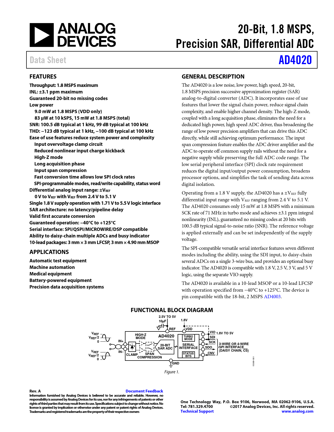 20-Bit, 1.8 MSPS,. Precision SAR, Differential ADC. Data Sheet. AD4020. FEATURES. GENERAL DESCRIPTION. Throughput: 1.8 MSPS maximum