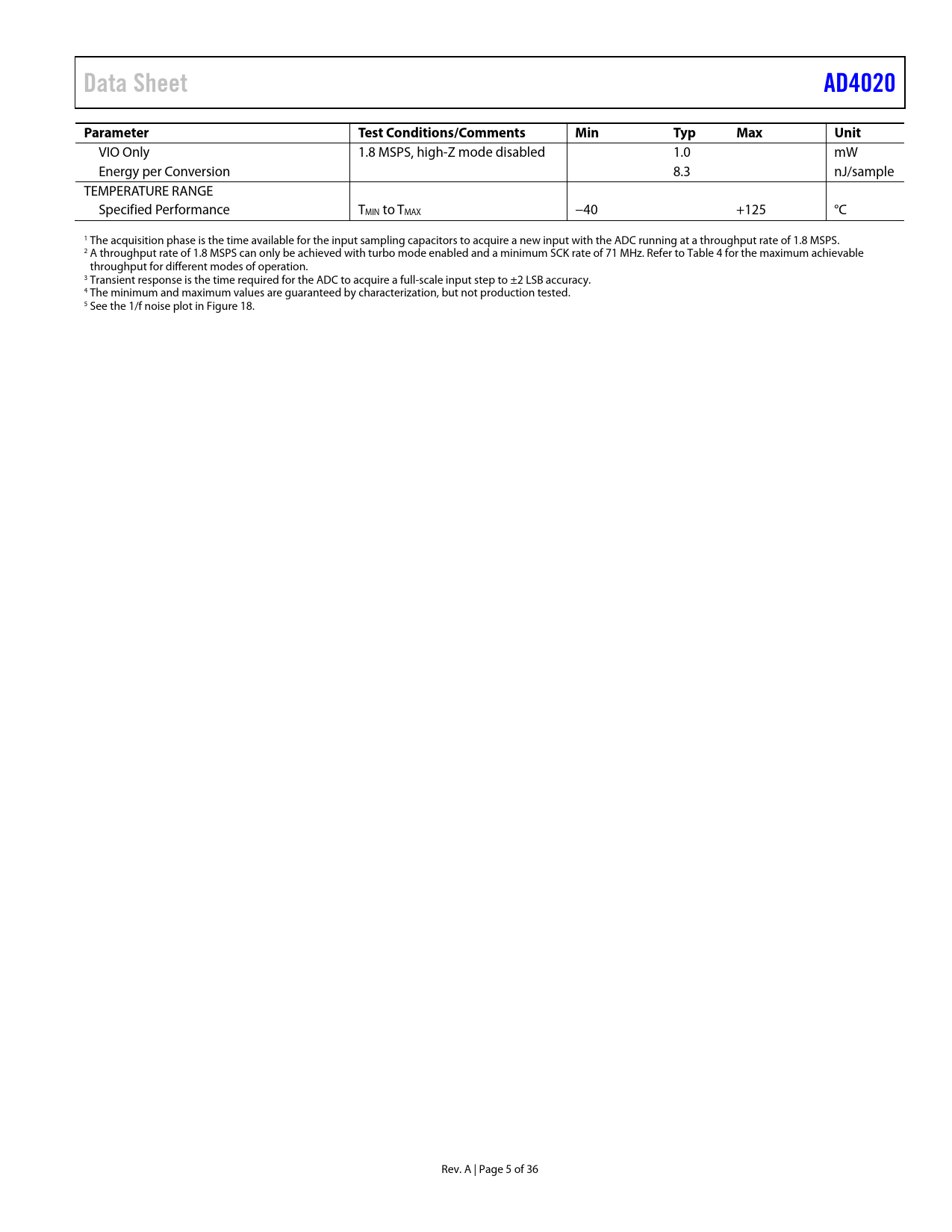 Seiten / Seite37 / 6 — Data Sheet. AD4020. Parameter. Test Conditions/Comments. Min. Typ. Max. …
