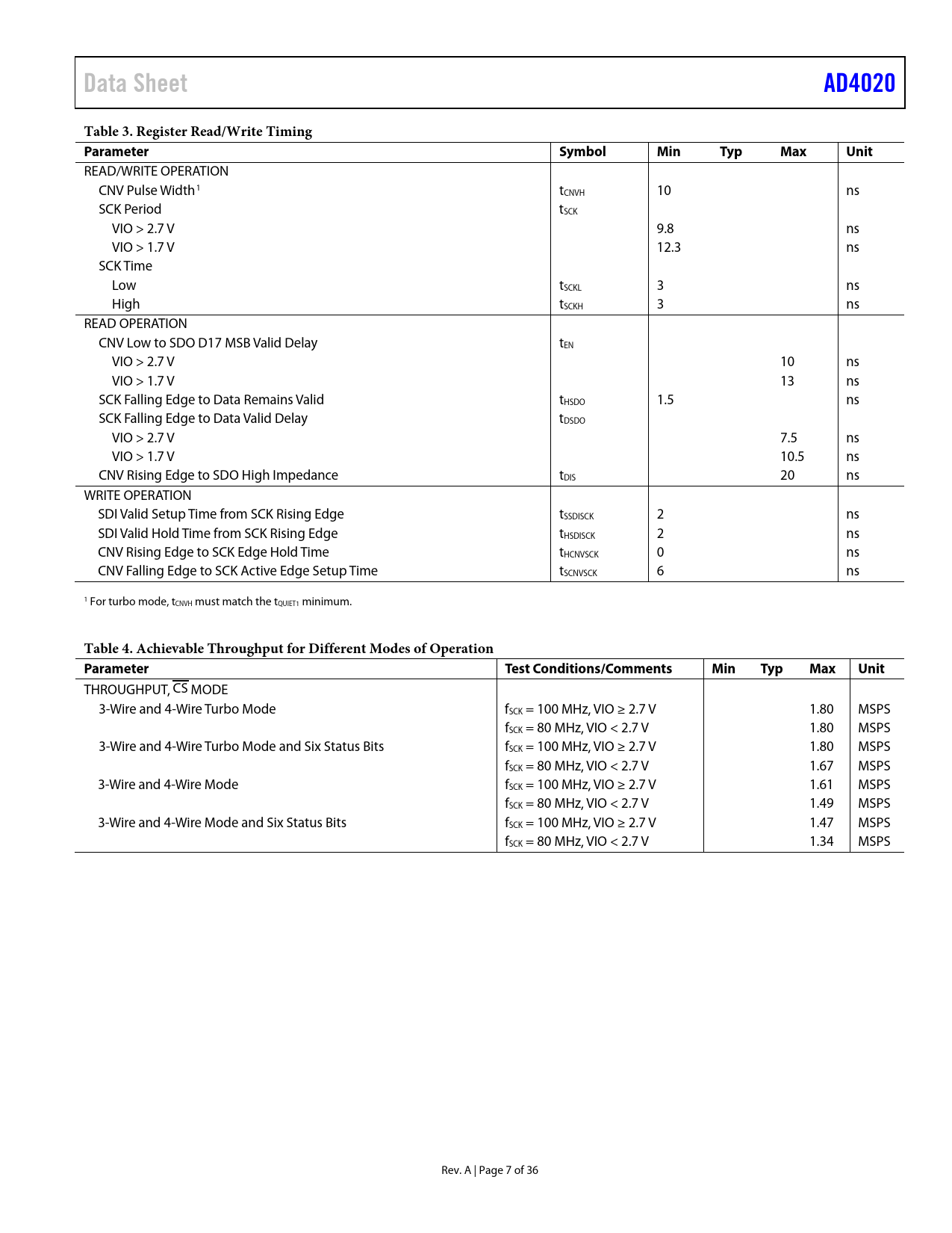 Data Sheet AD4020 Table 3. Register Read/Write Timing Parameter Symbol Min Typ Max Unit