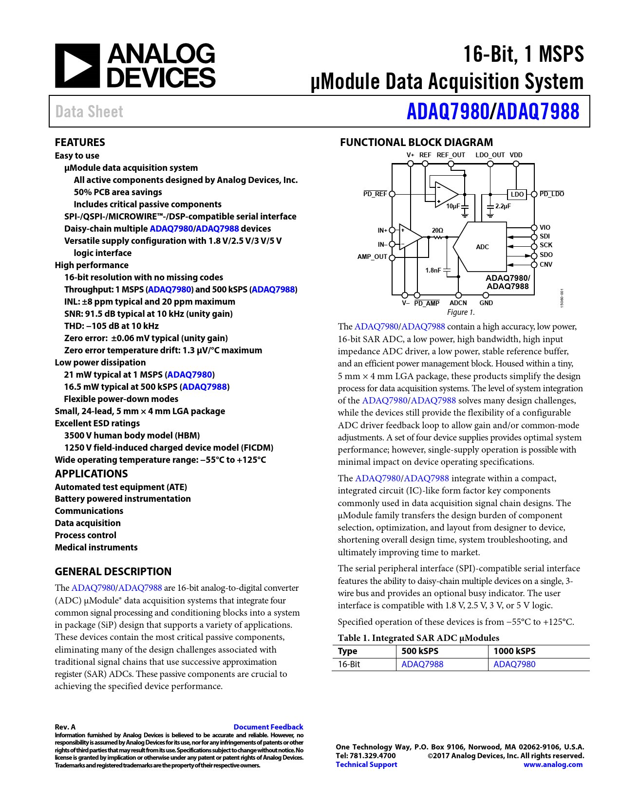 16-Bit, 1 MSPS. μModule Data Acquisition System. Data Sheet. ADAQ7980/. ADAQ7988. FEATURES. FUNCTIONAL BLOCK DIAGRAM. Easy to use