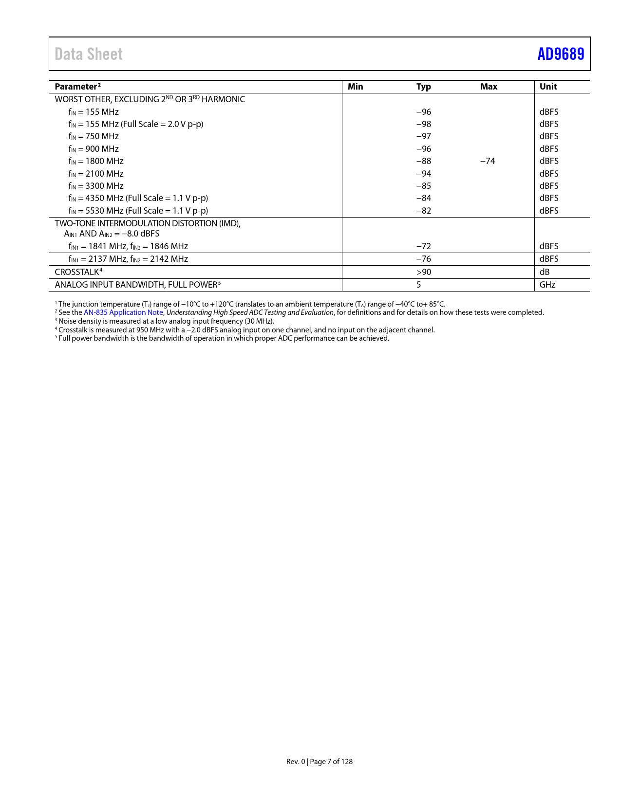 Data SheetAD9689Parameter2MinTypMaxUnit WORST OTHER, EXCLUDING 2ND OR 3RD HARMONIC fIN = 155 MHz −96 dBFS fIN = 155 MHz (Full Scale = 2.0 V p-p) −98 dBFS fIN = 750 MHz −97 dBFS fIN = 900 MHz −96 dBFS fIN = 1800 MHz −88 −74 dBFS fIN = 2100 MHz −94 dBFS fIN = 3300 MHz −85 dBFS fIN = 4350 MHz (Full Scale = 1.1 V p-p) −84 dBFS fIN = 5530 MHz (Full Scale = 1.1 V p-p) −82 dBFS TWO-TONE INTERMODULATION DISTORTION (IMD), AIN1 AND AIN2 = −8.0 dBFS fIN1 = 1841 MHz, fIN2 = 1846 MHz −72 dBFS fIN1 = 2137 MHz, fIN2 = 2142 MHz −76 dBFS CROSSTALK4 >90 dB ANALOG INPUT BANDWIDTH, FULL POWER5 5 GHz 1 The junction temperature (TJ) range of −10°C to +120°C translates to an ambient temperature (TA) range of −40°C to+ 85°C. 2 See the AN-835 Application Note, Understanding High Speed ADC Testing and Evaluation, for definitions and for details on how these tests were completed. 3 Noise density is measured at a low analog input frequency (30 MHz). 4 Crosstalk is measured at 950 MHz with a −2.0 dBFS analog input on one channel, and no input on the adjacent channel. 5 Full power bandwidth is the bandwidth of operation in which proper ADC performance can be achieved. Rev. 0 | Page 7 of 128 Document Outline FEATURES APPLICATIONS FUNCTIONAL BLOCK DIAGRAM TABLE OF CONTENTS REVISION HISTORY GENERAL DESCRIPTION PRODUCT HIGHLIGHTS SPECIFICATIONS DC SPECIFICATIONS AC SPECIFICATIONS DIGITAL SPECIFICATIONS SWITCHING SPECIFICATIONS TIMING SPECIFICATIONS Timing Diagrams ABSOLUTE MAXIMUM RATINGS THERMAL RESISTANCE ESD CAUTION PIN CONFIGURATION AND FUNCTION DESCRIPTIONS TYPICAL PERFORMANCE CHARACTERISTICS EQUIVALENT CIRCUITS THEORY OF OPERATION ADC ARCHITECTURE ANALOG INPUT CONSIDERATIONS Differential Input Configurations Input Common Mode Analog Input Buffer Controls and SFDR Optimization Dither Absolute Maximum Input Swing VOLTAGE REFERENCE DC OFFSET CALIBRATION CLOCK INPUT CONSIDERATIONS Clock Duty Cycle Considerations Input Clock Divider Input Clock Divider ½ Period Delay Adjust Clock Fine Delay and Superfine Delay Adjust Clock Coupling Considerations Clock Jitter Considerations POWER-DOWN AND STANDBY MODE TEMPERATURE DIODE ADC OVERRANGE AND FAST DETECT ADC OVERRANGE FAST THRESHOLD DETECTION (FD_A AND FD_B) ADC APPLICATION MODES AND JESD204B Tx CONVERTER MAPPING PROGRAMMABLE FIR FILTERS SUPPORTED MODES PROGRAMMING INSTRUCTIONS DIGITAL DOWNCONVERTER (DDC) DDC I/Q INPUT SELECTION DDC I/Q OUTPUT SELECTION DDC GENERAL DESCRIPTION DDC Frequency Translation Stage (Optional) DDC Filtering Stage DDC Gain Stage (Optional) DDC Complex to Real Conversion Stage (Optional) DDC FREQUENCY TRANSLATION DDC Frequency Translation General Description Variable IF Mode 0 Hz IF (ZIF) Mode fS/4 Hz IF Mode Test Mode DDC NCO Description DDC NCO Programmable Modulus Mode DDC NCO Coherent Mode NCO FTW/POW/MAW/MAB Description NCO FTW/POW/MAW/MAB Programmable Modulus Mode NCO FTW/POW/MAW/MAB Coherent Mode NCO Channel Selection GPIO Level Control Mode GPIO Edge Control Mode Register Map Mode Setting Up the Multichannel NCO Feature NCO Synchronization NCO Multichip Synchronization NCO Multichip Synchronization at Startup NCO Multichip Synchronization During Normal Operation DDC Mixer Description DDC NCO + Mixer Loss and SFDR DDC DECIMATION FILTERS HB4 Filter Description HB3 Filter Description HB2 Filter Description HB1 Filter Description TB2 Filter Description TB1 Filter Description FB2 Filter Description DDC GAIN STAGE DDC COMPLEX TO REAL CONVERSION DDC MIXED DECIMATION SETTINGS DDC EXAMPLE CONFIGURATIONS DDC POWER CONSUMPTION SIGNAL MONITOR SPORT OVER JESD204B DIGITAL OUTPUTS INTRODUCTION TO THE JESD204B INTERFACE JESD204B OVERVIEW FUNCTIONAL OVERVIEW Transport Layer Data Link Layer Physical Layer JESD204B LINK ESTABLISHMENT Code Group Synchronization (CGS) and SYNCINB± Initial Lane Alignment Sequence (ILAS) User Data and Error Detection 8-Bit/10-Bit Encoder PHYSICAL LAYER (DRIVER) OUTPUTS Digital Outputs, Timing, and Controls De-Emphasis Phase-Locked Loop (PLL) fS × 4 MODE SETTING UP THE AD9689 DIGITAL INTERFACE Example 1—Full Bandwidth Mode Example 2—ADC with DDC Option (Two ADCs Plus Two DDCs) DETERMINISTIC LATENCY SUBCLASS 0 OPERATION SUBCLASS 1 OPERATION Deterministic Latency Requirements Setting Deterministic Latency Registers MULTICHIP SYNCHRONIZATION NORMAL MODE TIMESTAMP MODE SYSREF INPUT SYSREF Control Features SYSREF± SETUP/HOLD WINDOW MONITOR LATENCY END TO END TOTAL LATENCY EXAMPLE LATENCY CALCULATIONS LMFC REFERENCED LATENCY TEST MODES ADC TEST MODES JESD204B BLOCK TEST MODES Transport Layer Sample Test Mode Interface Test Modes Data Link Layer Test Modes SERIAL PORT INTERFACE CONFIGURATION USING THE SPI HARDWARE INTERFACE SPI ACCESSIBLE FEATURES MEMORY MAP READING THE MEMORY MAP REGISTER TABLE Open and Reserved Locations Default Values Logic Levels Channel Specific Registers SPI Soft Reset MEMORY MAP REGISTER DETAILS Analog Devices SPI Registers Clock/SYSREF/Chip Power-Down Pin Control Registers Chip Operating Mode Control Registers Fast Detect and Signal Monitor Control Registers DDC Function Registers (See the Digital Downconverter (DDC) Section) Digital Outputs and Test Modes Programmable Filter (PFILT) Control and Coefficients Registers VREF/Analog Input Control Registers APPLICATIONS INFORMATION POWER SUPPLY RECOMMENDATIONS LAYOUT GUIDELINES AVDD1_SR (PIN E7) AND AGND (PIN E6 AND PIN E8) OUTLINE DIMENSIONS ORDERING GUIDE