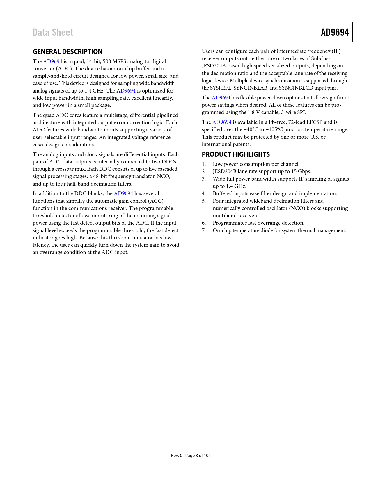 Seiten / Seite102 / 4 — Data Sheet. AD9694. GENERAL DESCRIPTION. PRODUCT HIGHLIGHTS