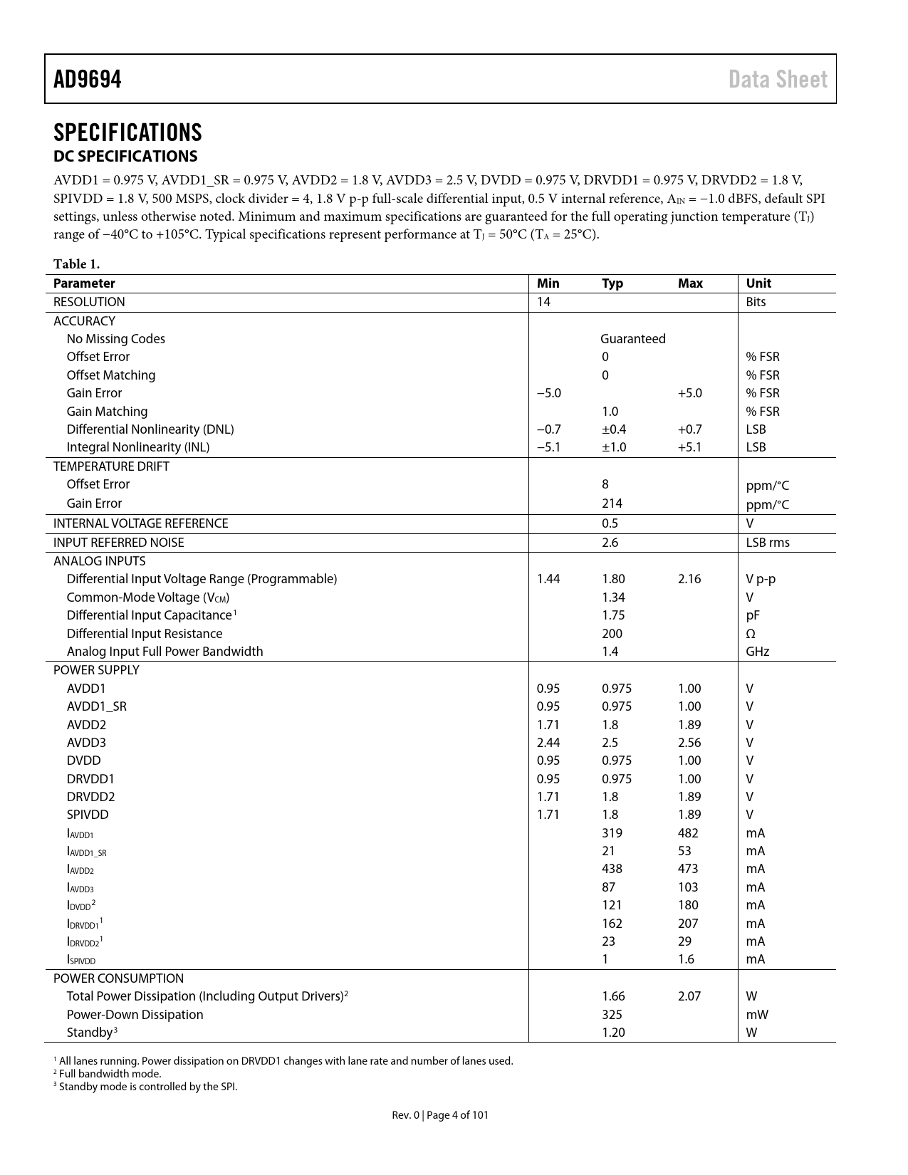 AD9694 Data Sheet SPECIFICATIONS DC SPECIFICATIONS Table 1 Parameter Min Typ Max Unit