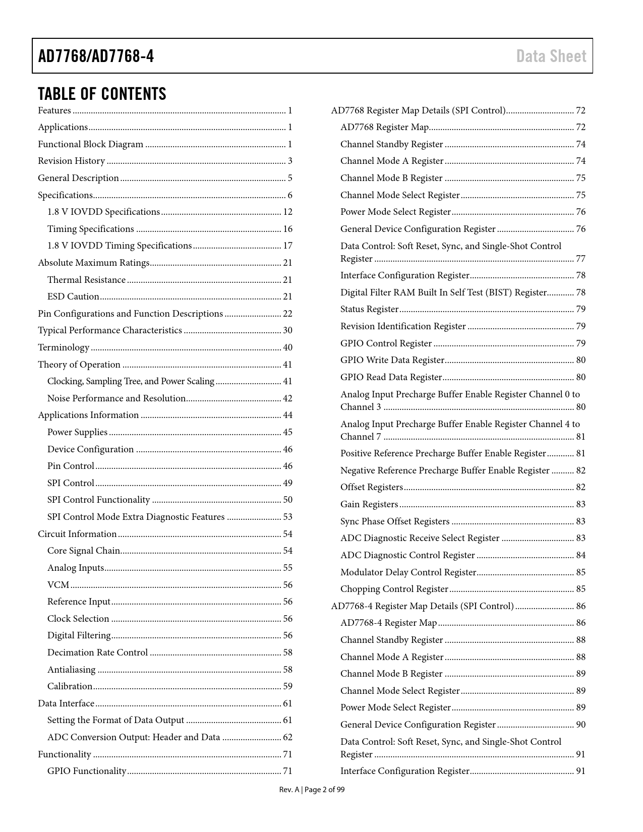 link to page 1 link to page 1 link to page 1 link to page 3 link to page 5 link to page 6 link to page 12 link to page 16 link to page 17 link to page 21 link to page 21 link to page 21 link to page 22 link to page 30 link to page 40 link to page 41 link to page 41 link to page 42 link to page 44 link to page 45 link to page 46 link to page 46 link to page 49 link to page 50 link to page 53 link to page 54 link to page 54 link to page 55 link to page 56 link to page 56 link to page 56 link to page 56 link to page 58 link to page 58 link to page 59 link to page 61 link to page 61 link to page 62 link to page 71 link to page 71 link to page 72 link to page 72 link to page 74 link to page 74 link to page 75 link to page 75 link to page 76 link to page 76 link to page 77 link to page 77 link to page 78 link to page 78 link to page 79 link to page 79 link to page 79 link to page 80 link to page 80 link to page 80 link to page 80 link to page 81 link to page 81 link to page 81 link to page 82 link to page 82 link to page 83 link to page 83 link to page 83 link to page 84 link to page 85 link to page 85 link to page 86 link to page 86 link to page 88 link to page 88 link to page 89 link to page 89 link to page 89 link to page 90 link to page 91 link to page 91 link to page 91 AD7768/AD7768-4Data SheetTABLE OF CONTENTS Features .. 1 AD7768 Register Map Details (SPI Control) .. 72 Applications ... 1 AD7768 Register Map.. 72 Functional Block Diagram .. 1 Channel Standby Register ... 74 Revision History ... 3 Channel Mode A Register ... 74 General Description ... 5 Channel Mode B Register ... 75 Specifications ... 6 Channel Mode Select Register .. 75 1.8 V IOVDD Specifications ... 12 Power Mode Select Register .. 76 Timing Specifications .. 16 General Device Configuration Register .. 76 1.8 V IOVDD Timing Specifications ... 17 Data Control: Soft Reset, Sync, and Single-Shot Control Absolute Maximum Ratings .. 21 Register .. 77 Thermal Resistance .. 21 Interface Configuration Register .. 78 ESD Caution .. 21 Digital Filter RAM Built In Self Test (BIST) Register.. 78 Pin Configurations and Function Descriptions ... 22 Status Register ... 79 Typical Performance Characteristics ... 30 Revision Identification Register ... 79 Terminology .. 40 GPIO Control Register .. 79 Theory of Operation .. 41 GPIO Write Data Register ... 80 Clocking, Sampling Tree, and Power Scaling ... 41 GPIO Read Data Register .. 80 Noise Performance and Resolution .. 42 Analog Input Precharge Buffer Enable Register Channel 0 to Channel 3 .. 80 Applications Information .. 44 Analog Input Precharge Buffer Enable Register Channel 4 to Power Supplies .. 45 Channel 7 .. 81 Device Configuration .. 46 Positive Reference Precharge Buffer Enable Register .. 81 Pin Control .. 46 Negative Reference Precharge Buffer Enable Register .. 82 SPI Control .. 49 Offset Registers ... 82 SPI Control Functionality ... 50 Gain Registers ... 83 SPI Control Mode Extra Diagnostic Features .. 53 Sync Phase Offset Registers .. 83 Circuit Information .. 54 ADC Diagnostic Receive Select Register .. 83 Core Signal Chain ... 54 ADC Diagnostic Control Register ... 84 Analog Inputs .. 55 Modulator Delay Control Register ... 85 VCM ... 56 Chopping Control Register ... 85 Reference Input ... 56 AD7768-4 Register Map Details (SPI Control) .. 86 Clock Selection ... 56 AD7768-4 Register Map .. 86 Digital Filtering ... 56 Channel Standby Register ... 88 Decimation Rate Control .. 58 Channel Mode A Register ... 88 Antialiasing ... 58 Channel Mode B Register ... 89 Calibration ... 59 Channel Mode Select Register .. 89 Data Interface .. 61 Power Mode Select Register .. 89 Setting the Format of Data Output .. 61 General Device Configuration Register .. 90 ADC Conversion Output: Header and Data .. 62 Data Control: Soft Reset, Sync, and Single-Shot Control Functionality ... 71 Register .. 91 GPIO Functionality .. 71 Interface Configuration Register .. 91 Rev. A | Page 2 of 99 Document Outline FEATURES APPLICATIONS FUNCTIONAL BLOCK DIAGRAM TABLE OF CONTENTS REVISION HISTORY GENERAL DESCRIPTION SPECIFICATIONS 1.8 V IOVDD SPECIFICATIONS TIMING SPECIFICATIONS 1.8 V IOVDD TIMING SPECIFICATIONS Timing Diagrams ABSOLUTE MAXIMUM RATINGS THERMAL RESISTANCE ESD CAUTION PIN CONFIGURATIONS AND FUNCTION DESCRIPTIONS TYPICAL PERFORMANCE CHARACTERISTICS TERMINOLOGY THEORY OF OPERATION CLOCKING, SAMPLING TREE, AND POWER SCALING Example of Power vs. Noise Performance Optimization Configuration A Configuration B Clocking Out the ADC Conversion Results (DCLK) NOISE PERFORMANCE AND RESOLUTION APPLICATIONS INFORMATION POWER SUPPLIES Recommended Power Supply Configuration 1.8 V IOVDD Operation Analog Supply Internal Connectivity DEVICE CONFIGURATION Interface Data Format PIN CONTROL Setting the Filter Setting the Decimation Rate Operating Mode Diagnostics Configuration Example Channel Standby SPI CONTROL Accessing the ADC Register Map SPI Interface Details SPI Control Interface Error Handling SPI Reset Configuration SPI CONTROL FUNCTIONALITY Channel Configuration Channel Modes Reset over SPI Control Interface Sleep Mode Channel Standby Clocking Selections MCLK Source Selection Interface Configuration CRC Protection ADC Synchronization over SPI Analog Input Precharge Buffers Reference Precharge Buffers Per Channel Calibration Gain, Offset, and Sync Phase GPIOs SPI CONTROL MODE EXTRA DIAGNOSTIC FEATURES RAM Built In Self Test Revision Identification Number Diagnostic Meter Mode CIRCUIT INFORMATION CORE SIGNAL CHAIN ADC Power Modes ANALOG INPUTS VCM REFERENCE INPUT CLOCK SELECTION DIGITAL FILTERING Sinc5 Filter Wideband Low Ripple Filter DECIMATION RATE CONTROL ANTIALIASING Modulator Sampling Frequency Modulator Chopping Frequency Modulator Saturation Point CALIBRATION Offset Adjustment Gain Adjustment Sync Phase Offset Adjustment DATA INTERFACE SETTING THE FORMAT OF DATA OUTPUT ADC CONVERSION OUTPUT: HEADER AND DATA Chip Error Filter Not Settled Repeated Data Filter Type Filter Saturated Channel ID
