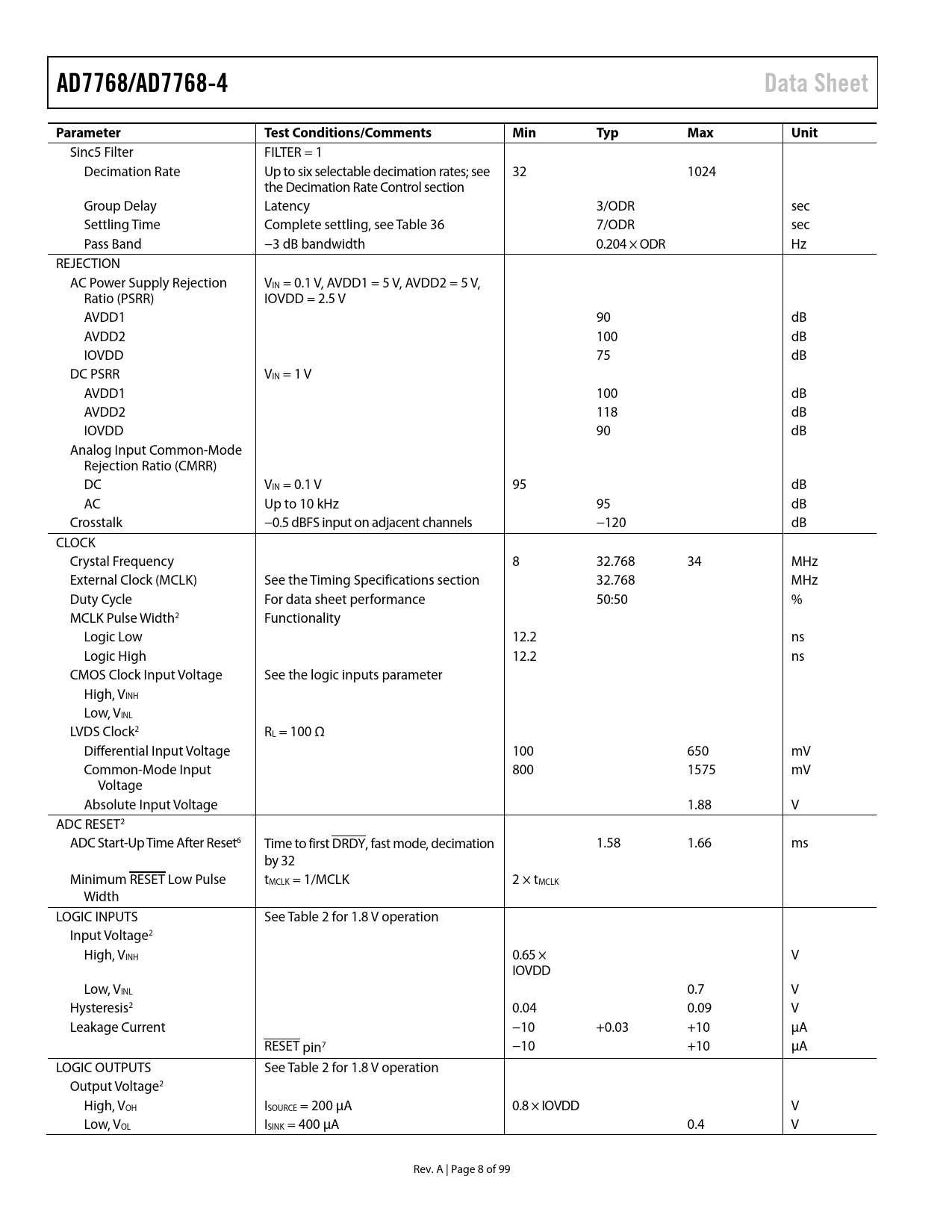 Seiten / Seite99 / 8 — AD7768/AD7768-4. Data Sheet. Parameter. Test Conditions/Comments. Min. …