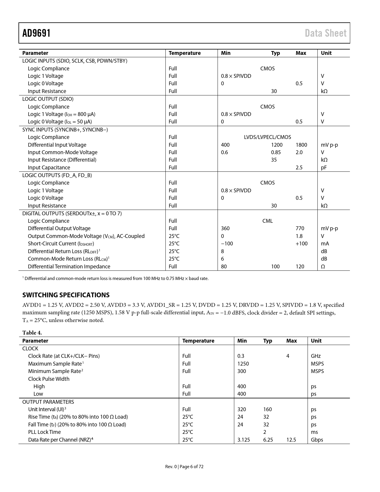 link to page 8 link to page 8 link to page 8 link to page 8 AD9691Data SheetParameterTemperatureMinTypMaxUnit LOGIC INPUTS (SDIO, SCLK, CSB, PDWN/STBY) Logic Compliance Full CMOS Logic 1 Voltage Full 0.8 × SPIVDD V Logic 0 Voltage Full 0 0.5 V Input Resistance Full 30 kΩ LOGIC OUTPUT (SDIO) Logic Compliance Full CMOS Logic 1 Voltage (IOH = 800 µA) Full 0.8 × SPIVDD V Logic 0 Voltage (IOL = 50 µA) Full 0 0.5 V SYNC INPUTS (SYNCINB+, SYNCINB−) Logic Compliance Full LVDS/LVPECL/CMOS Differential Input Voltage Full 400 1200 1800 mV p-p Input Common-Mode Voltage Full 0.6 0.85 2.0 V Input Resistance (Differential) Full 35 kΩ Input Capacitance Full 2.5 pF LOGIC OUTPUTS (FD_A, FD_B) Logic Compliance Full CMOS Logic 1 Voltage Full 0.8 × SPIVDD V Logic 0 Voltage Full 0 0.5 V Input Resistance Full 30 kΩ DIGITAL OUTPUTS (SERDOUTx±, x = 0 TO 7) Logic Compliance Full CML Differential Output Voltage Full 360 770 mV p-p Output Common-Mode Voltage (VCM), AC-Coupled 25°C 0 1.8 V Short-Circuit Current (IDSHORT) 25°C −100 +100 mA Differential Return Loss (RLDIFF)1 25°C 8 dB Common-Mode Return Loss (RLCM)1 25°C 6 dB Differential Termination Impedance Full 80 100 120 Ω 1 Differential and common-mode return loss is measured from 100 MHz to 0.75 MHz × baud rate. SWITCHING SPECIFICATIONS AVDD1 = 1.25 V, AVDD2 = 2.50 V, AVDD3 = 3.3 V, AVDD1_SR = 1.25 V, DVDD = 1.25 V, DRVDD = 1.25 V, SPIVDD = 1.8 V, specified maximum sampling rate (1250 MSPS), 1.58 V p-p ful -scale differential input, AIN = −1.0 dBFS, clock divider = 2, default SPI settings, TA = 25°C, unless otherwise noted. Table 4. ParameterTemperatureMinTypMaxUnit CLOCK Clock Rate (at CLK+/CLK− Pins) Full 0.3 4 GHz Maximum Sample Rate1 Full 1250 MSPS Minimum Sample Rate2 Full 300 MSPS Clock Pulse Width High Full 400 ps Low Full 400 ps OUTPUT PARAMETERS Unit Interval (UI)3 Full 320 160 ps Rise Time (tR) (20% to 80% into 100 Ω Load) 25°C 24 32 ps Fall Time (tF) (20% to 80% into 100 Ω Load) 25°C 24 32 ps PLL Lock Time 25°C 2 ms Data Rate per Channel (NRZ)4 25°C 3.125 6.25 12.5 Gbps Rev. 0 | Page 6 of 72 Document Outline FEATURES APPLICATIONS GENERAL DESCRIPTION FUNCTIONAL BLOCK DIAGRAM PRODUCT HIGHLIGHTS TABLE OF CONTENTS REVISION HISTORY SPECIFICATIONS DC SPECIFICATIONS AC SPECIFICATIONS DIGITAL SPECIFICATIONS SWITCHING SPECIFICATIONS TIMING SPECIFICATIONS Timing Diagrams ABSOLUTE MAXIMUM RATINGS THERMAL CHARACTERISTICS ESD CAUTION PIN CONFIGURATION AND FUNCTION DESCRIPTIONS TYPICAL PERFORMANCE CHARACTERISTICS EQUIVALENT CIRCUITS THEORY OF OPERATION ADC ARCHITECTURE ANALOG INPUT CONSIDERATIONS Differential Input Configurations Input Common Mode Analog Input Controls and SFDR Optimization Absolute Maximum Input Swing VOLTAGE REFERENCE CLOCK INPUT CONSIDERATIONS Clock Duty Cycle Considerations Input Clock Divider ½ Period Delay Adjust Input Clock Divider Clock Fine Delay Adjust Clock Jitter Considerations POWER-DOWN/STANDBY MODE TEMPERATURE DIODE ADC OVERRANGE AND FAST DETECT ADC OVERRANGE FAST THRESHOLD DETECTION (FD_A AND FD_B) SIGNAL MONITOR SPORT Over JESD204B DIGITAL DOWNCONVERTERS (DDCS) DDC I/Q INPUT SELECTION DDC I/Q OUTPUT SELECTION DDC GENERAL DESCRIPTION FREQUENCY TRANSLATION GENERAL DESCRIPTION Variable IF Mode 0 Hz IF (ZIF) Mode fS/4 Hz IF Mode Test Mode DDC NCO PLUS MIXER LOSS AND SFDR NUMERICALLY CONTROLLED OSCILLATOR Setting Up the NCO FTW and POW NCO Synchronization Mixer FIR FILTERS GENERAL DESCRIPTION HALF-BAND FILTERS HB4 Filter HB3 Filter HB2 Filter HB1 Filter DDC GAIN STAGE DDC COMPLEX TO REAL CONVERSION BLOCK DDC EXAMPLE CONFIGURATIONS DIGITAL OUTPUTS INTRODUCTION TO THE JESD204B INTERFACE JESD204B OVERVIEW FUNCTIONAL OVERVIEW Transport Layer Data Link Layer Physical Layer JESD204B LINK ESTABLISHMENT Code Group Synchronization (CGS) and SYNCINB± Initial Lane Alignment Sequence (ILAS) User Data and Error Detection 8B/10B Encoder PHYSICAL LAYER (DRIVER) OUTPUTS Digital Outputs, Timing, and Controls De-Emphasis Phase-Locked Loop (PLL) CONFIGURING THE JESD204B LINK Example 1: Full Bandwidth Mode Example 2: ADC with DDC Option (Two ADCs Plus Two DDCs ) MULTICHIP SYNCHRONIZATION SYSREF± SETUP/HOLD WINDOW MONITOR TEST MODES ADC TEST MODES JESD204B BLOCK TEST MODES Transport Layer Sample Test Mode Interface Test Modes Data Link Layer Test Modes SERIAL PORT INTERFACE CONFIGURATION USING THE SPI HARDWARE INTERFACE SPI ACCESSIBLE FEATURES MEMORY MAP READING THE MEMORY MAP REGISTER TABLE Unassigned and Reserved Locations Default Values Logic Levels Channel-Specific Registers SPI Soft Reset MEMORY MAP REGISTER TABLE APPLICATIONS INFORMATION POWER SUPPLY RECOMMENDATIONS EXPOSED PAD THERMAL HEAT SLUG RECOMMENDATIONS AVDD1_SR (PIN 78) AND AGND (PIN 77 AND PIN 81) OUTLINE DIMENSIONS ORDERING GUIDE