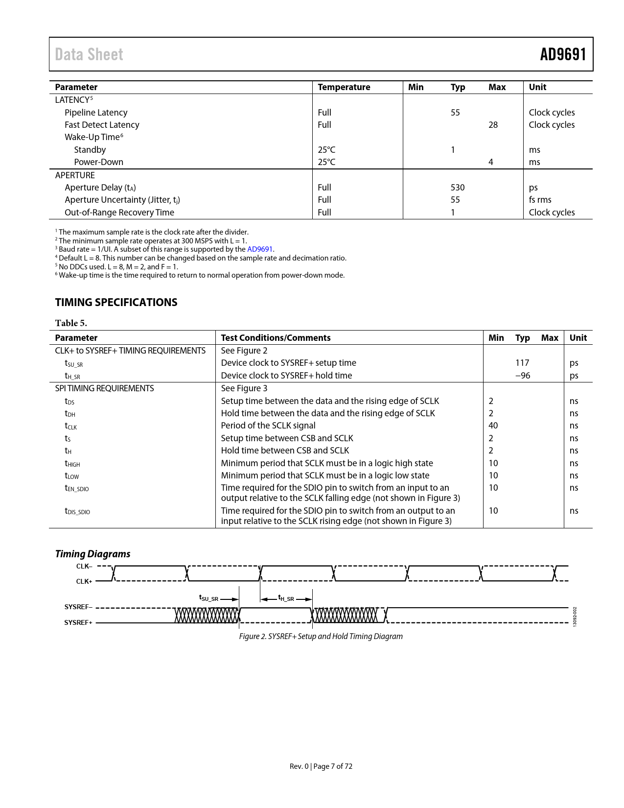 LATENCY5 Pipeline Latency Full 55 Clock cycles Fast Detect Latency Full 28 Clock cycles Wake-Up Time6 Standby 25°C 1 ms Power-Down 25°C 4 ms APERTURE Aperture Delay (tA) Full 530 ps Aperture Uncertainty (Jitter, tj) Full 55 fs rms Out-of-Range Recovery Time Full 1 Clock cycles 1 The maximum sample rate is the clock rate after the divider. 2 The minimum sample rate operates at 300 MSPS with L = 1. 3 Baud rate = 1/UI. A subset of this range is supported by the AD9691. 4 Default L = 8. This number can be changed based on the sample rate and decimation ratio. 5 No DDCs used. L = 8, M = 2, and F = 1. 6 Wake-up time is the time required to return to normal operation from power-down mode.