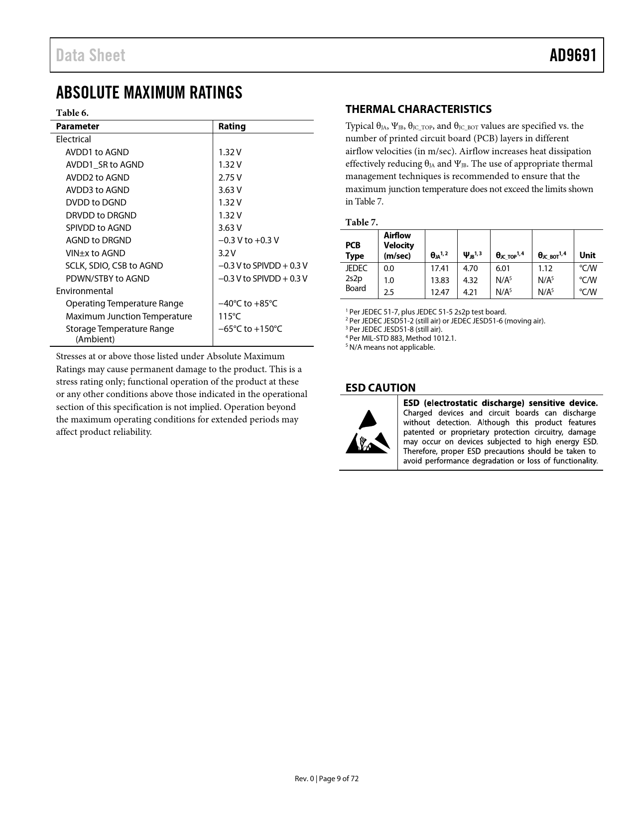 Data Sheet AD9691 ABSOLUTE MAXIMUM RATINGS Table 6 THERMAL CHARACTERISTICS Parameter Rating Table 7 Airflow PCB Velocity Type
