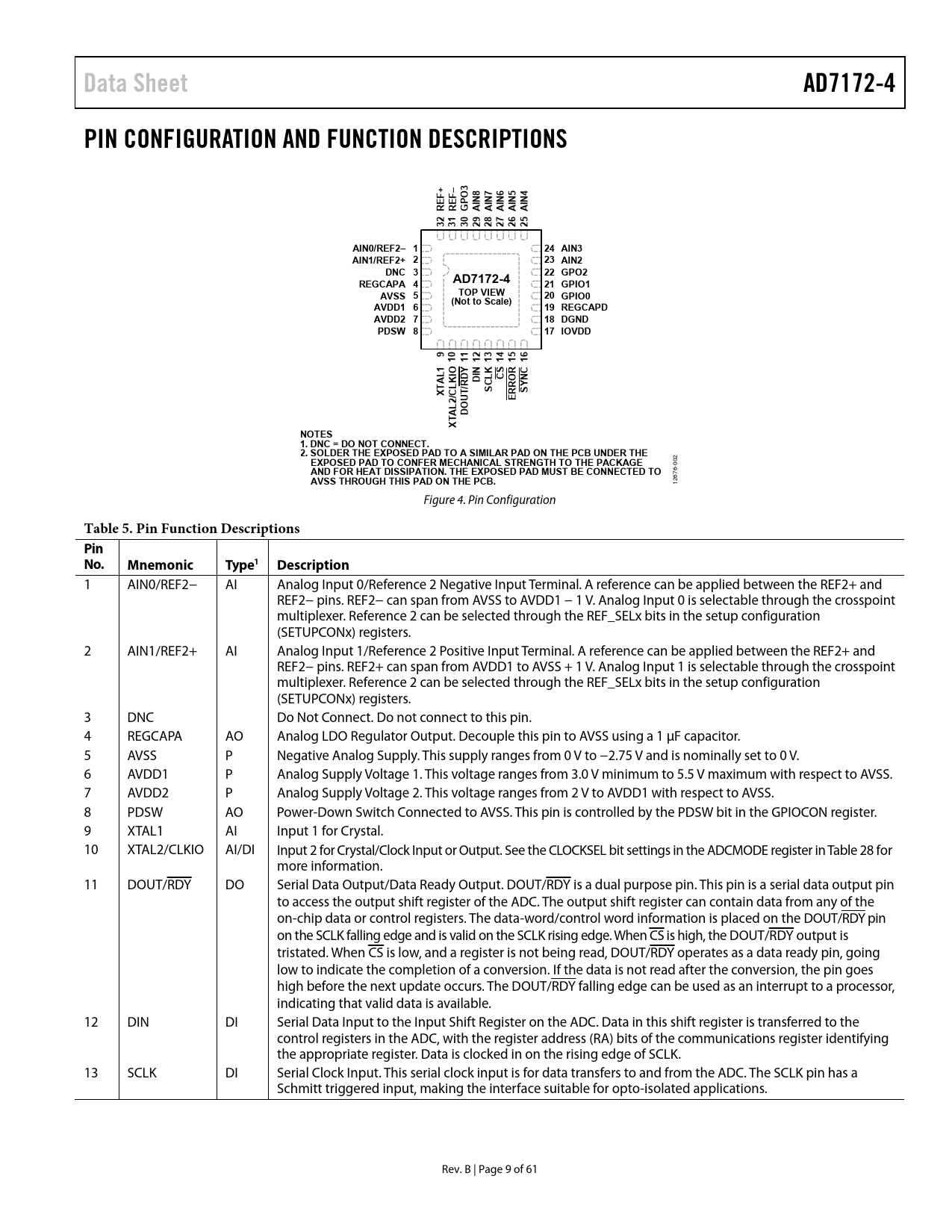 Data Sheet. AD7172-4. PIN CONFIGURATION AND FUNCTION DESCRIPTIONS. AIN0/REF2– 1. 24 AIN3. AIN1/REF2+ 2. 23 AIN2. DNC 3. 22 GPO2