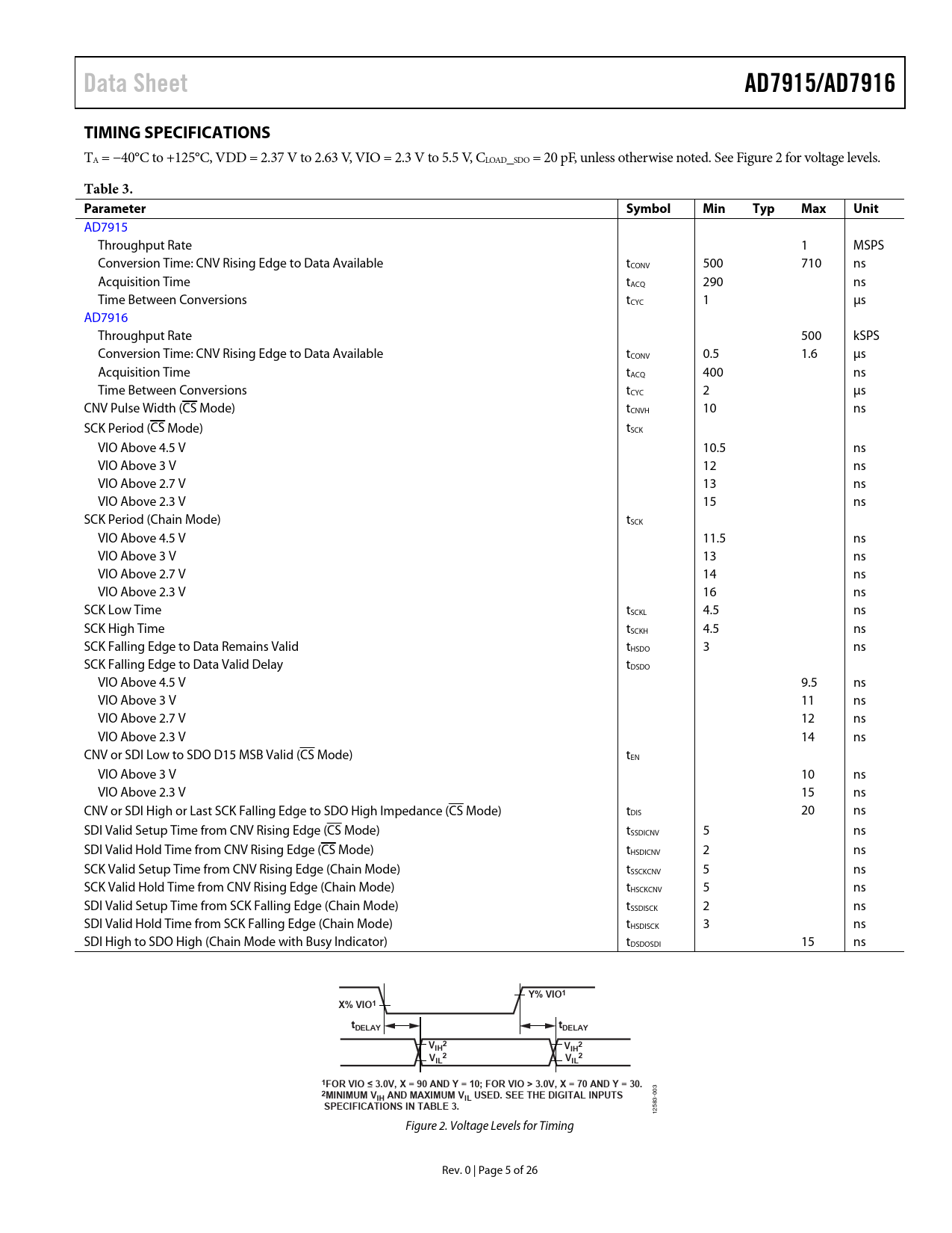 Data Sheet. AD7915/AD7916. TIMING SPECIFICATIONS. Table 3. Parameter. Symbol Min Typ Max Unit. Y% VIO1. X% VIO1. tDELAY. V 2. VIL