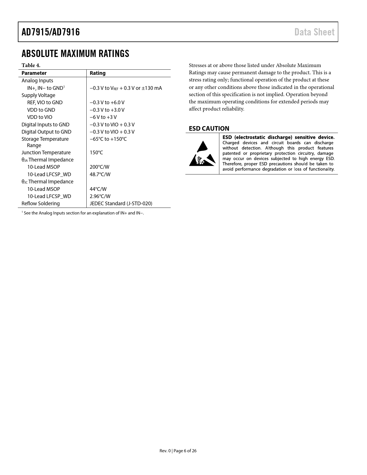 AD7915/AD7916. Data Sheet. ABSOLUTE MAXIMUM RATINGS Table 4. Parameter Rating. ESD CAUTION