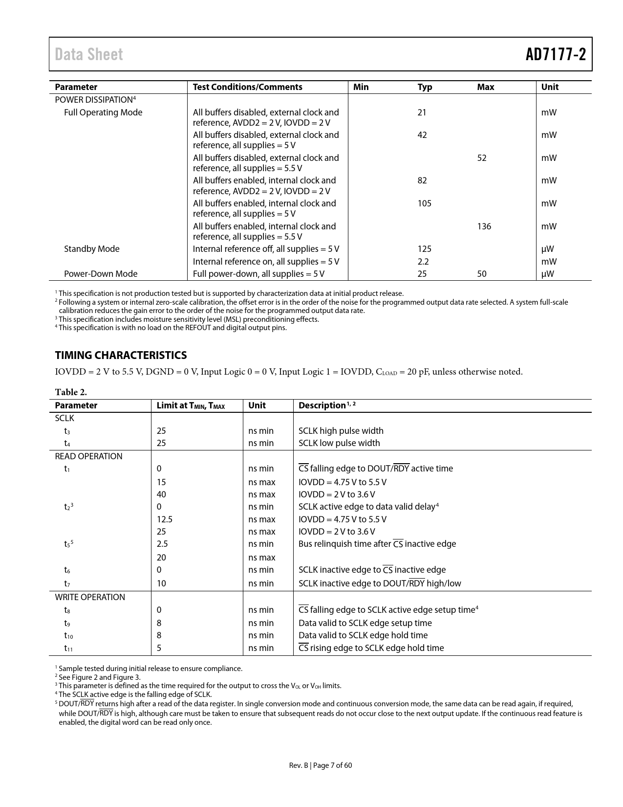 link to page 9 link to page 9 Data SheetAD7177-2ParameterTest Conditions/CommentsMinTypMaxUnit POWER DISSIPATION4 Full Operating Mode All buffers disabled, external clock and 21 mW reference, AVDD2 = 2 V, IOVDD = 2 V All buffers disabled, external clock and 42 mW reference, all supplies = 5 V All buffers disabled, external clock and 52 mW reference, all supplies = 5.5 V All buffers enabled, internal clock and 82 mW reference, AVDD2 = 2 V, IOVDD = 2 V All buffers enabled, internal clock and 105 mW reference, all supplies = 5 V All buffers enabled, internal clock and 136 mW reference, all supplies = 5.5 V Standby Mode Internal reference off, all supplies = 5 V 125 µW Internal reference on, all supplies = 5 V 2.2 mW Power-Down Mode Full power-down, all supplies = 5 V 25 50 µW 1 This specification is not production tested but is supported by characterization data at initial product release. 2 Following a system or internal zero-scale calibration, the offset error is in the order of the noise for the programmed output data rate selected. A system full-scale calibration reduces the gain error to the order of the noise for the programmed output data rate. 3 This specification includes moisture sensitivity level (MSL) preconditioning effects. 4 This specification is with no load on the REFOUT and digital output pins. TIMING CHARACTERISTICS IOVDD = 2 V to 5.5 V, DGND = 0 V, Input Logic 0 = 0 V, Input Logic 1 = IOVDD, CLOAD = 20 pF, unless otherwise noted. Table 2. ParameterLimit at TMIN, TMAXUnitDescription1, 2 SCLK t3 25 ns min SCLK high pulse width t4 25 ns min SCLK low pulse width READ OPERATION t1 0 ns min CS falling edge to DOUT/RDY active time 15 ns max IOVDD = 4.75 V to 5.5 V 40 ns max IOVDD = 2 V to 3.6 V t 3 2 0 ns min SCLK active edge to data valid delay4 12.5 ns max IOVDD = 4.75 V to 5.5 V 25 ns max IOVDD = 2 V to 3.6 V t 5 5 2.5 ns min Bus relinquish time after CS inactive edge 20 ns max t6 0 ns min SCLK inactive edge to CS inactive edge t7 10 ns min SCLK inactive edge to DOUT/RDY high/low WRITE OPERATION t8 0 ns min CS falling edge to SCLK active edge setup time4 t9 8 ns min Data valid to SCLK edge setup time t10 8 ns min Data valid to SCLK edge hold time t11 5 ns min CS rising edge to SCLK edge hold time 1 Sample tested during initial release to ensure compliance. 2 See Figure 2 and Figure 3. 3 This parameter is defined as the time required for the output to cross the VOL or VOH limits. 4 The SCLK active edge is the falling edge of SCLK. 5 DOUT/RDY returns high after a read of the data register. In single conversion mode and continuous conversion mode, the same data can be read again, if required, while DOUT/RDY is high, although care must be taken to ensure that subsequent reads do not occur close to the next output update. If the continuous read feature is enabled, the digital word can be read only once. Rev. B | Page 7 of 60 Document Outline FEATURES APPLICATIONS GENERAL DESCRIPTION FUNCTIONAL BLOCK DIAGRAM TABLE OF CONTENTS REVISION HISTORY SPECIFICATIONS TIMING CHARACTERISTICS Timing Diagrams ABSOLUTE MAXIMUM RATINGS THERMAL RESISTANCE ESD CAUTION PIN CONFIGURATION AND FUNCTION DESCRIPTIONS TYPICAL PERFORMANCE CHARACTERISTICS NOISE PERFORMANCE AND RESOLUTION GETTING STARTED POWER SUPPLIES DIGITAL COMMUNICATION Accessing the ADC Register Map AD7177-2 RESET CONFIGURATION OVERVIEW Channel Configuration Channel Registers ADC Setups Setup Configuration Registers Filter Configuration Registers Gain Registers Offset Registers ADC Mode and Interface Mode Configuration ADC Mode Register Interface Mode Register Understanding Configuration Flexibility CIRCUIT DESCRIPTION BUFFERED ANALOG INPUT CROSSPOINT MULTIPLEXER Fully Differential Inputs Single-Ended Inputs AD7177-2 REFERENCE External Reference Internal Reference BUFFERED REFERENCE INPUT CLOCK SOURCE Internal Oscillator External Crystal External Clock DIGITAL FILTERS SINC5 + SINC1 FILTER SINC3 FILTER SINGLE CYCLE SETTLING ENHANCED 50 HZ AND 60 HZ REJECTION FILTERS OPERATING MODES CONTINUOUS CONVERSION MODE CONTINUOUS READ MODE SINGLE CONVERSION MODE STANDBY AND POWER-DOWN MODES CALIBRATION DIGITAL INTERFACE CHECKSUM PROTECTION CRC CALCULATION Polynomial Example of a Polynomial CRC Calculation—24-Bit Word: 0x654321 (Eight Command Bits and 16-Bit Data) XOR Calculation Example of an XOR Calculation—24-Bit Word: 0x654321 (Eight Command Bits and 16-Bit Data) INTEGRATED FUNCTIONS GENERAL-PURPOSE I/O EXTERNAL MULTIPLEXER CONTROL DELAY 24-BIT/32-BIT CONVERSIONS DOUT_RESET SYNCHRONIZATION Normal Synchronization Alternate Synchronization ERROR FLAGS ADC_ERROR CRC_ERROR REG_ERROR Input/Output DATA_STAT IOSTRENGTH INTERNAL TEMPERATURE SENSOR GROUNDING AND LAYOUT REGISTER SUMMARY REGISTER DETAILS COMMUNICATIONS REGISTER STATUS REGISTER ADC MODE REGISTER INTERFACE MODE REGISTER REGISTER CHECK DATA REGISTER GPIO CONFIGURATION REGISTER ID REGISTER CHANNEL REGISTER 0 CHANNEL REGISTER 1 TO CHANNEL REGISTER 3 SETUP CONFIGURATION REGISTER 0 SETUP CONFIGURATION REGISTER 1 TO SETUP CONFIGURATION REGISTER 3 FILTER CONFIGURATION REGISTER 0 FILTER CONFIGURATION REGISTER 1 TO FILTER CONFIGURATION REGISTER 3 OFFSET REGISTER 0 OFFSET REGISTER 1 TO OFFSET REGISTER 3 GAIN REGISTER 0 GAIN REGISTER 1 TO GAIN REGISTER 3 OUTLINE DIMENSIONS ORDERING GUIDE